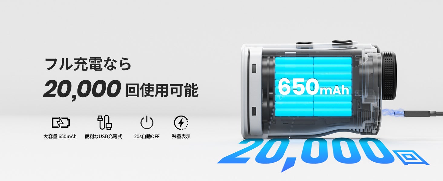 電池交換不要で、約2時間でフル充電が可能。1回のフル充電で約20000回の測定ができ、ディスプレイ画面にバッテリー残量が表示されるため、試合前の確認も簡単です。自動電源オフ機能により省エネ効果も高いです。