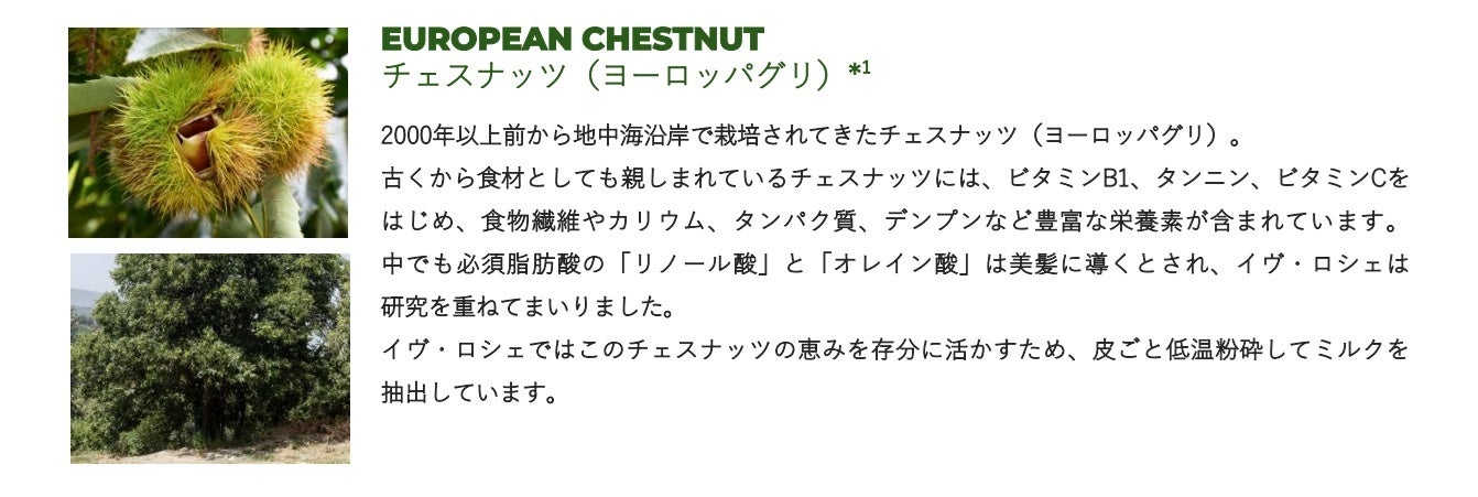中でも必須脂肪酸の「リノール酸」と「オレイン酸」は美髪に導くとされる成分です。イヴ・ロシェは研究を重ねた結果、このチェスナッツの恵みを存分に活かすため、皮ごと低温粉砕してミルクを抽出しています。