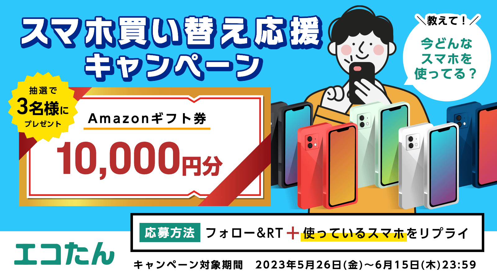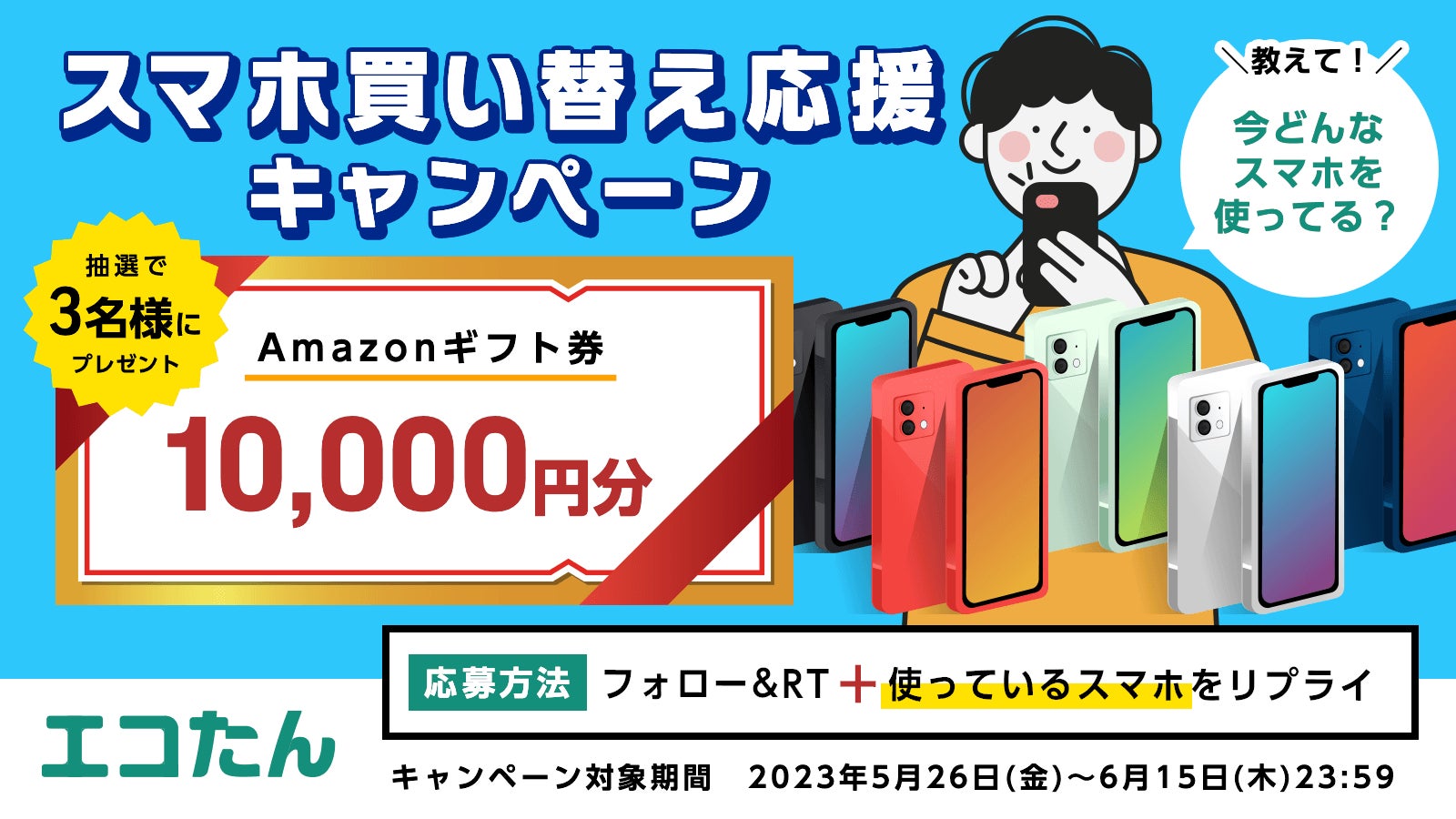 このたび、「エコたんスマホ買い替え応援キャンペーン」を開催いたします。公式Twitterアカウントをフォロー&RT+今お使いのスマホをリプライしていただいた方から抽選でAmazonギフト券¥10,000を3名様にプレゼント!