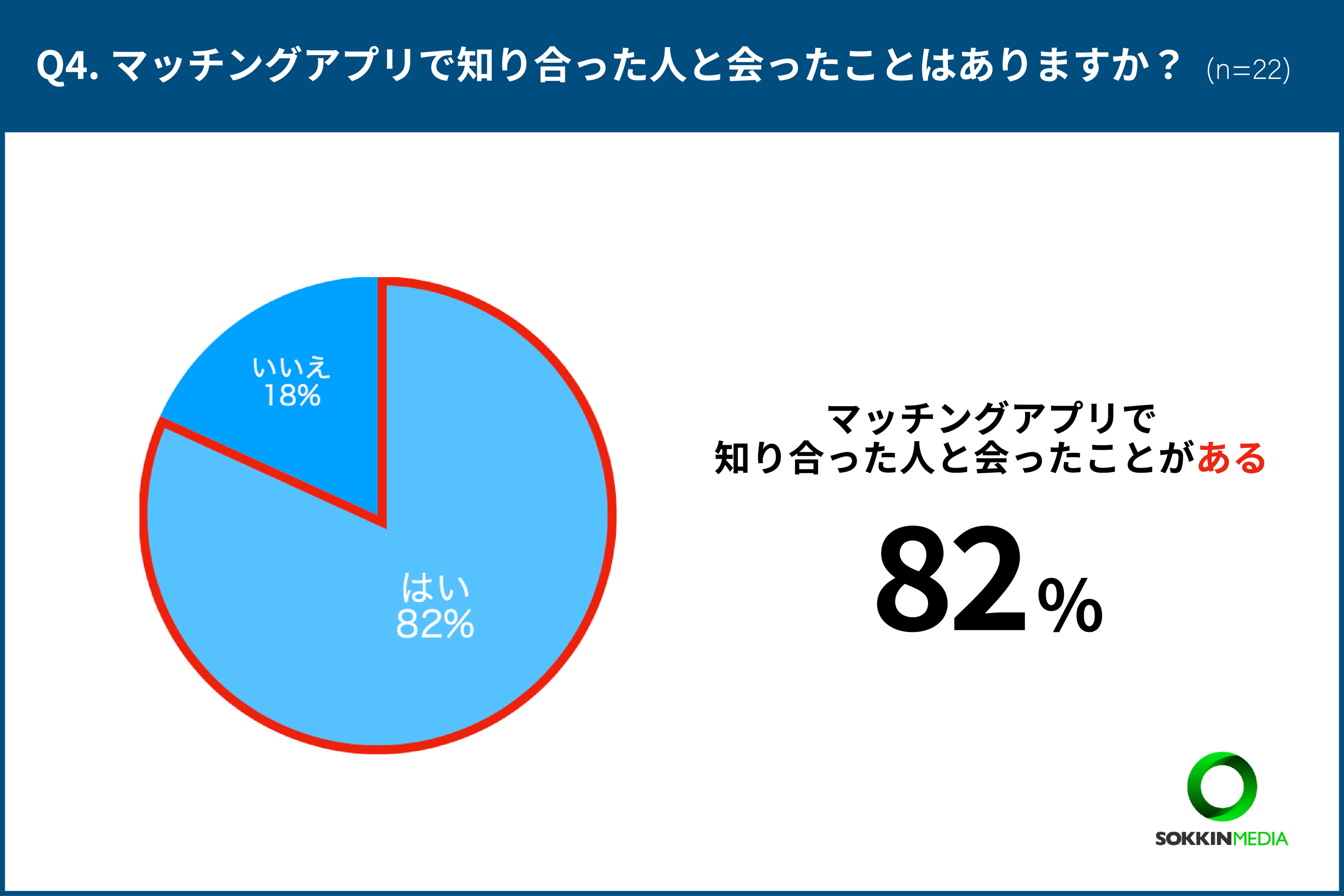 「Q4.マッチングアプリで知り合った人と実際に会ったことはありますか?」という問いに対して、「はい」と答えた方が全体の82%を占めました。マッチングアプリを利用している看護師のうち、10人中8人は実際にマッチした人と会っていることがわかります。