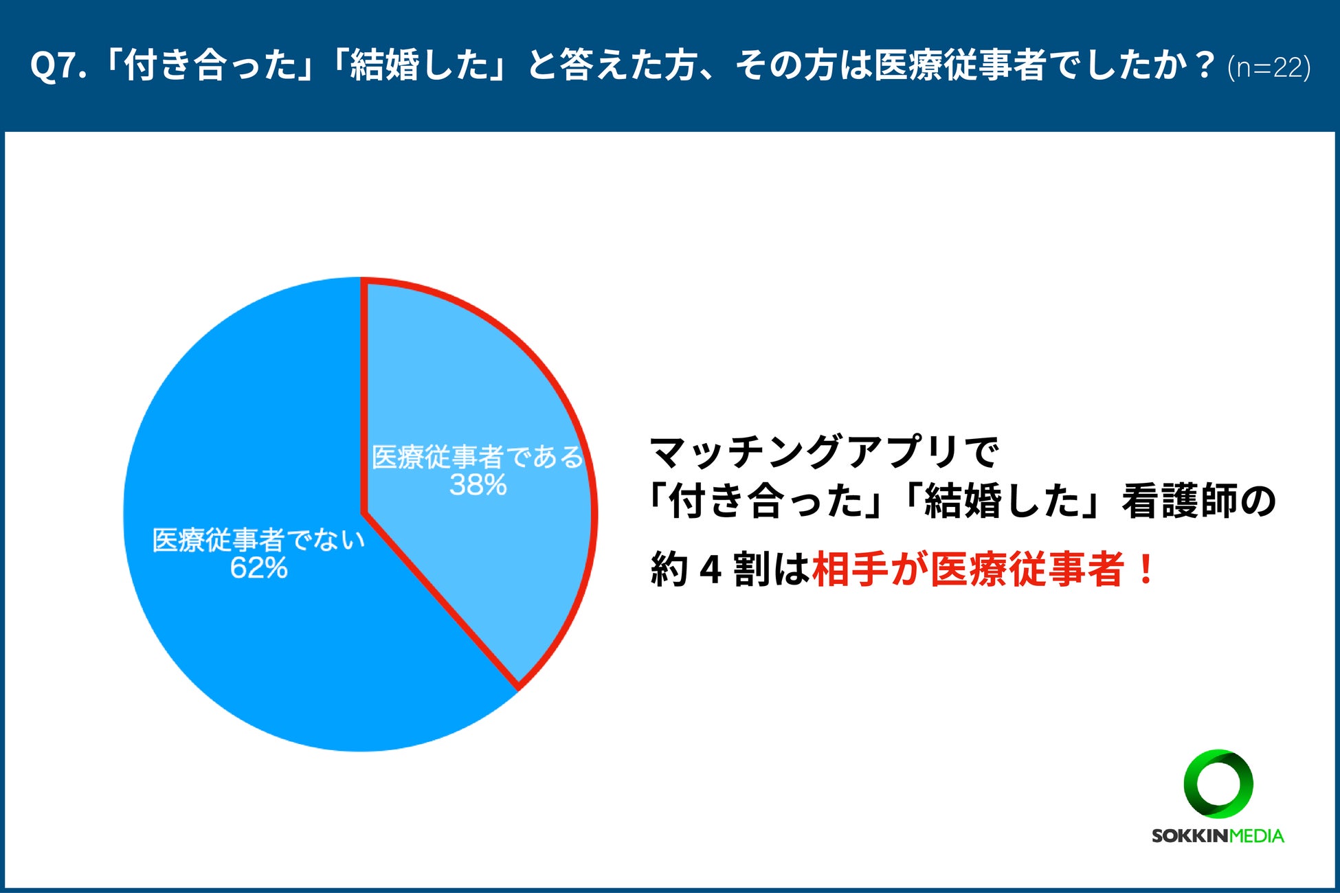 「Q7.(Q6に対して) 「付き合った」「結婚した」と答えた方、その方は医療業界の方でしたか?」とう問いに対して、「はい(医療従事者である)」と答えた看護師の割合は38%に上りました。