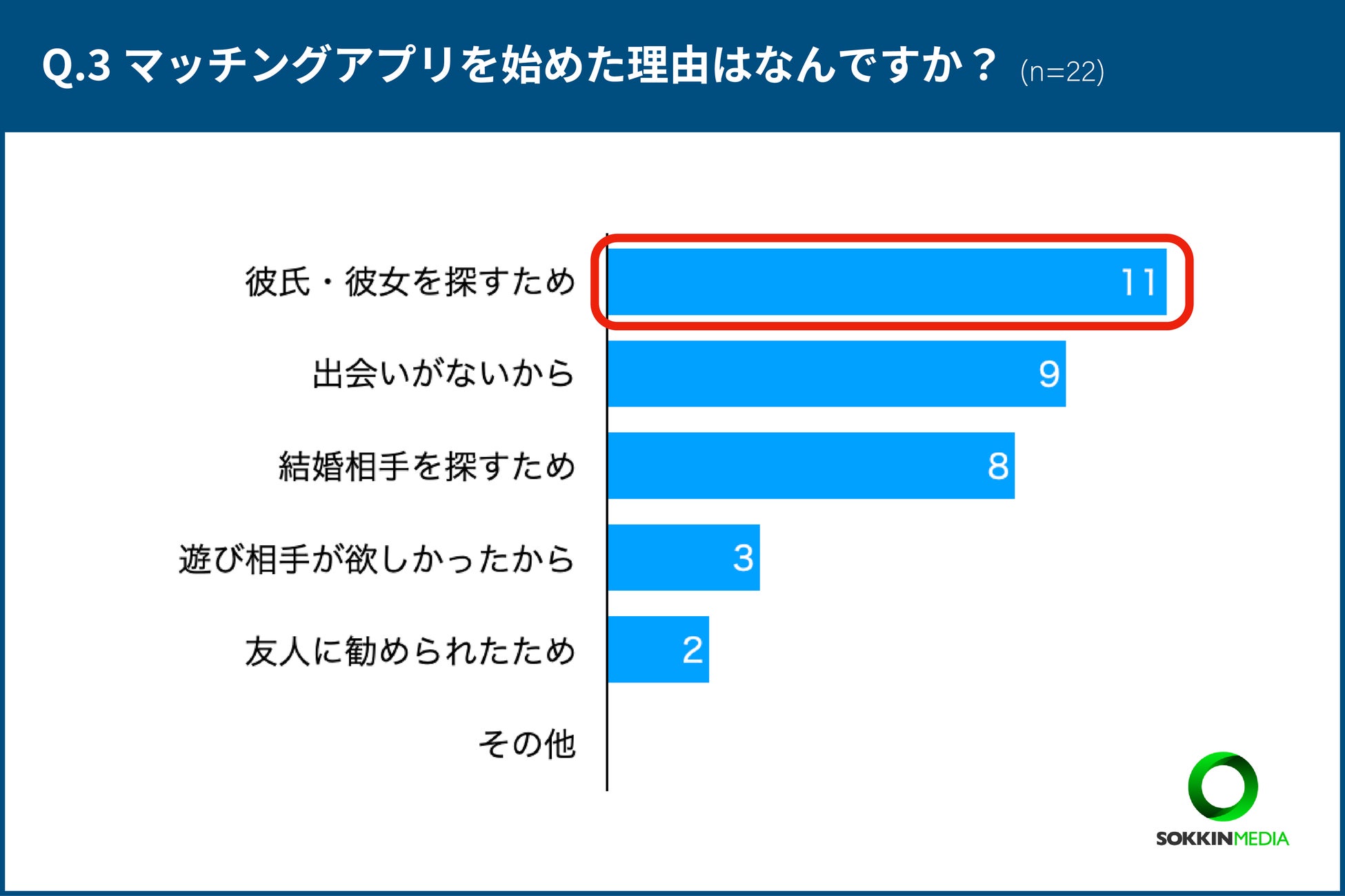 「Q3.マッチングアプリを始めた理由はなんですか?(複数選択可)」という問いに対して、「彼氏・彼女を探すため」が一番多く全体の33%(11票)を占めました。次いで「出会いがないから」が27%(9票)と、真剣な出会いを求めて登録する看護師が多いと想定されます。