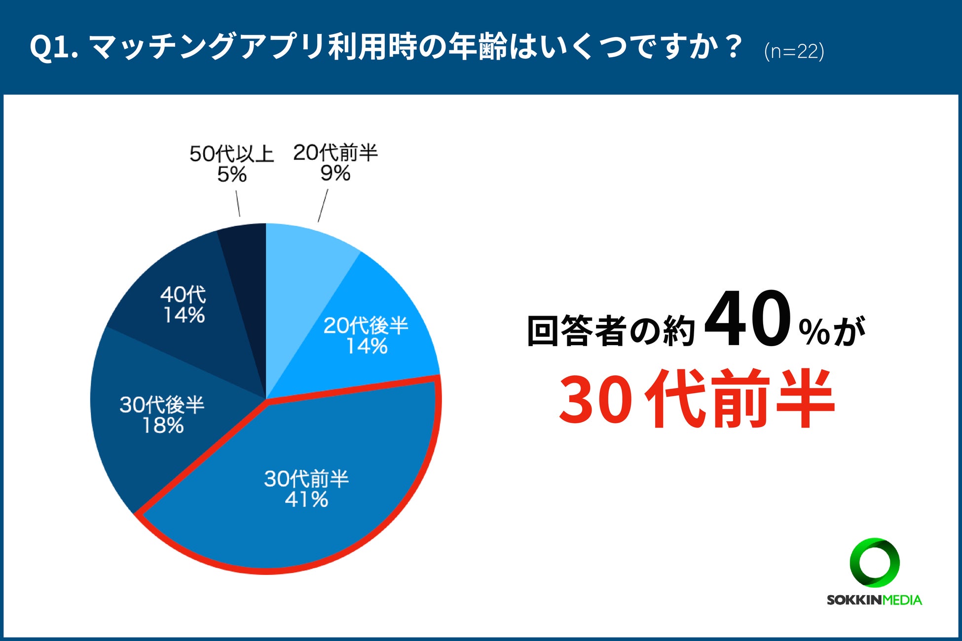 「Q1.マッチングアプリ利用時の年齢はおいくつですか?」という問いに対して、「30代前半」という人が最も多く全体の41%を占めました。次いで「30代後半」18%となっています。