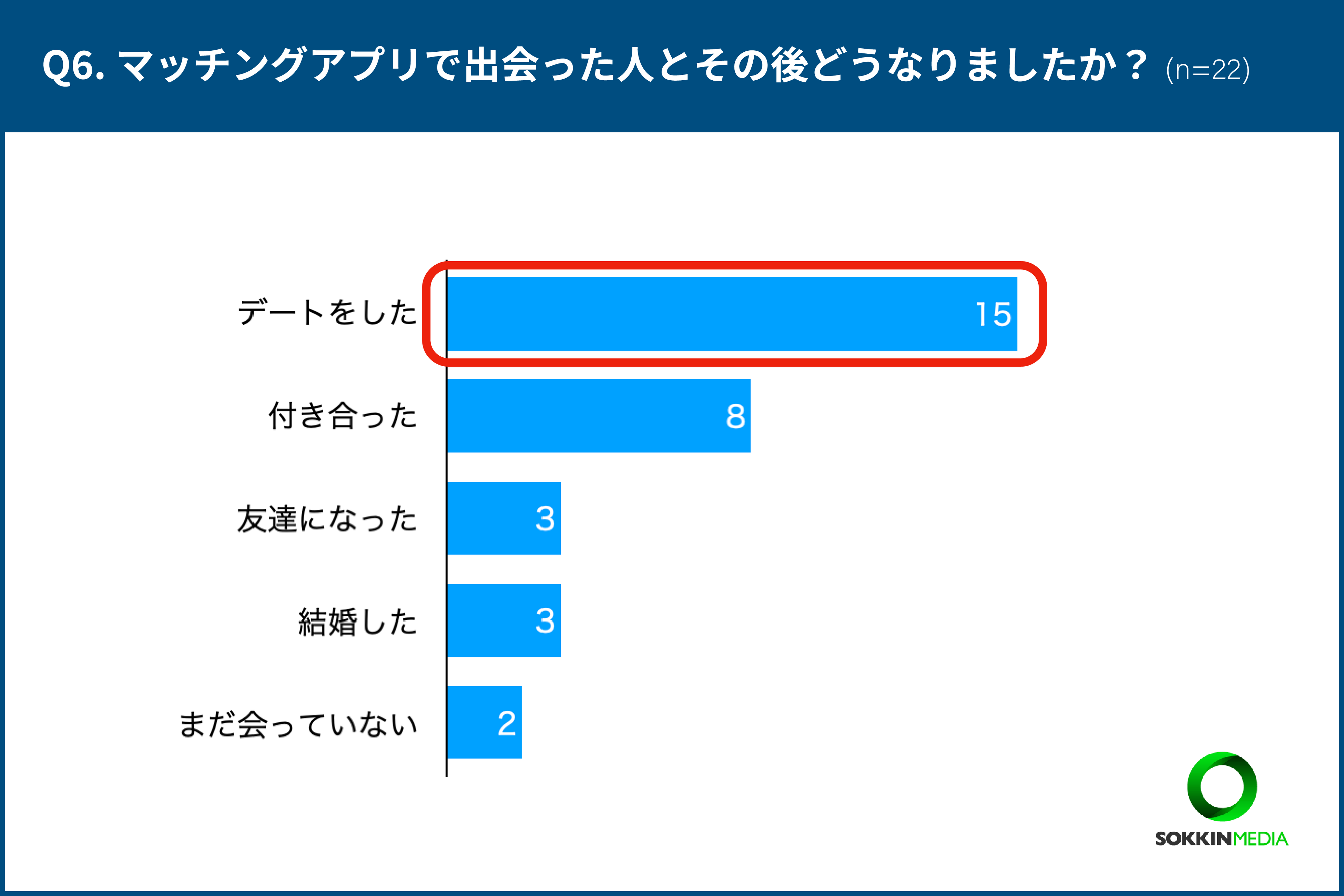 「Q6.マッチングアプリで出会った人とその後どうなりましたか?(複数選択可)」という問いに対して、「デートをした」という人が最も多く全体の48%(15票)を占めました。次いで、「付き合った」が26%(8票)という結果になりました。「デートをした」と答えた人の、約半数の人が交際に至っていることがわかります。
