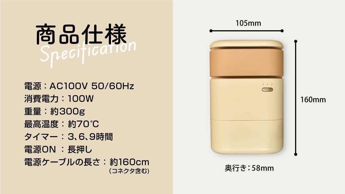 本プロジェクトの製品は手のひらに収まるコンパクトなサイズの温風で靴を乾かせる、超小型温風靴乾燥機です。サイズは高さ160mm幅107mm奥行58mm。重さ300g。靴箱に入れて収納できるサイズです。本体内に収納されている2本の蛇腹を引き出し、靴にセット電源を入れると約70度の温風が噴き出し、靴を乾かします。3,6,9時間の3段階のタイマー設定が可能。