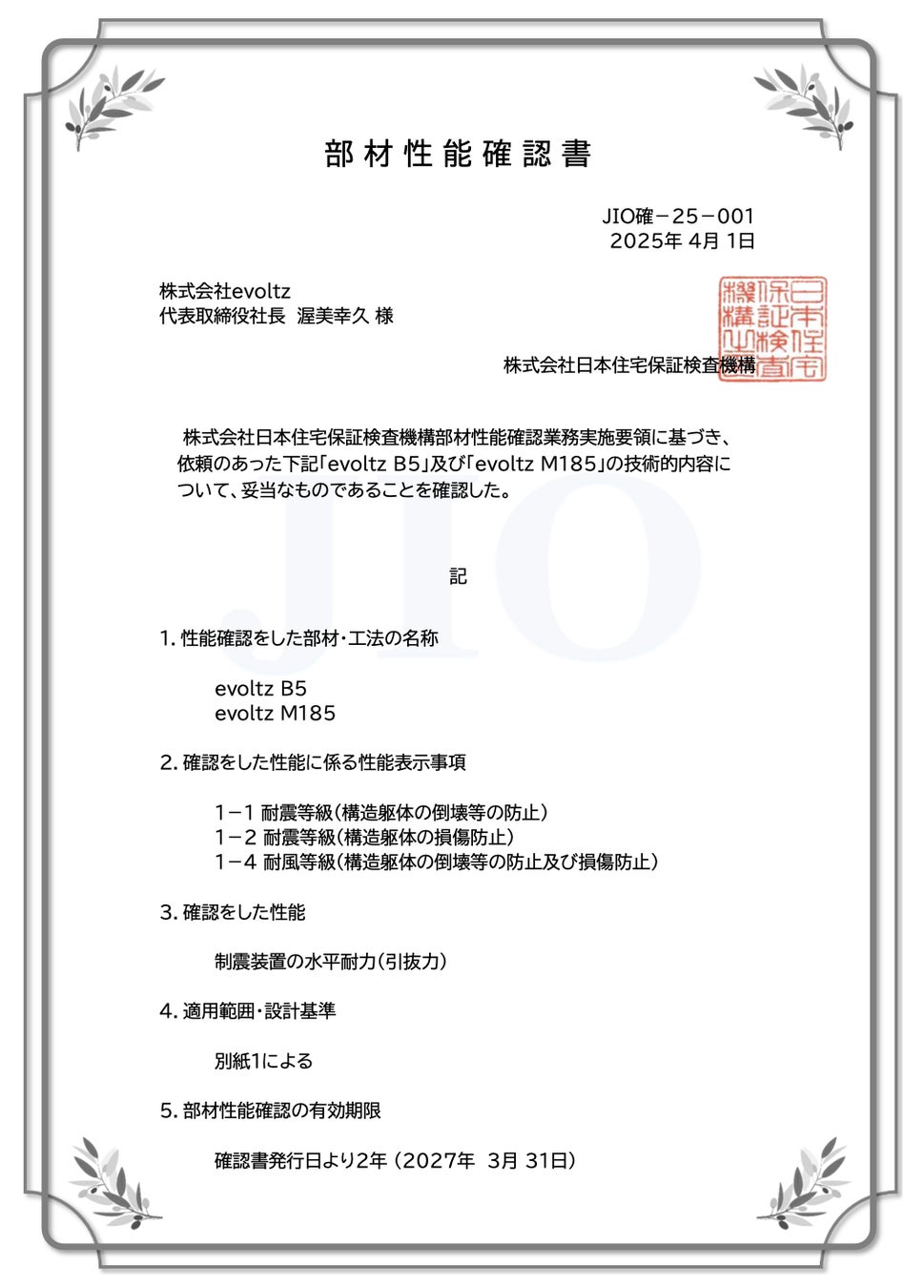 株式会社evoltz(本社:静岡県浜松市、代表取締役:渥美幸久)は、当社が開発・販売する木造軸組工法(在来工法)専用の制振装置「evoltz B5」「evoltz M185」が、株式会社日本住宅保証検査機構(JIO)による部材性能確認書(JIO確-25-001)を2025年4月1日付で取得したことをお知らせします。