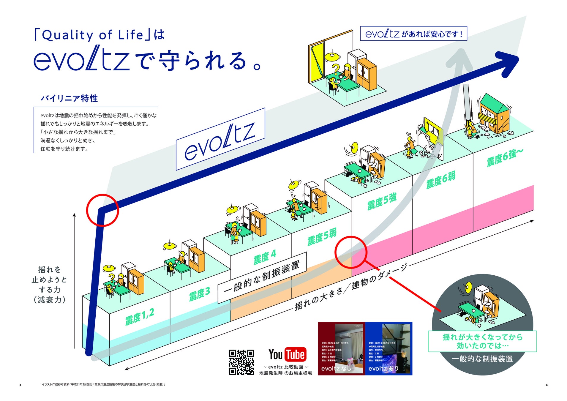 evoltzの制振装置「evoltz 」は、震度1程度の小さな揺れから震度7の大きな揺れまで効果的に対応するバイリニア特性を備えています。木造住宅向けに小型化されたこの製品は、特許を取得しており、最大限の制振効果を発揮します。
