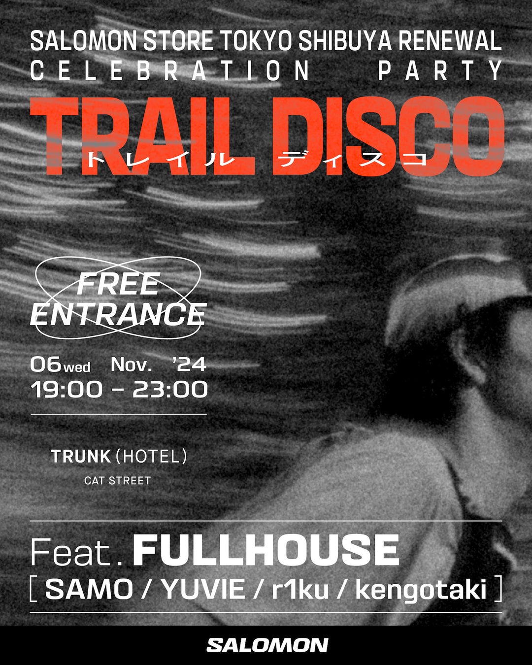 関西を拠点に活動するコレクティブ、FULLHOUSEからSAMO、YUVIE、r1ku、kengotakiを招いたDJプレイの他、この日限定のサロモンオリジナルカクテルも提供いたします。新しいサロモンストア 東京 渋谷の門出を祝う特別な夜をお楽しみください。