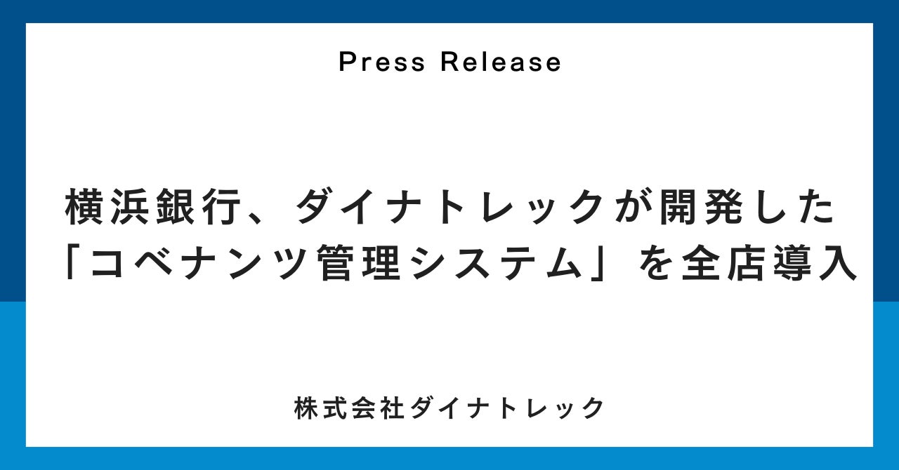 株式会社ダイナトレック(本社:東京都港区、代表取締役 佐伯 譲二、以下「ダイナトレック」)は、コンコルディア・フィナンシャルグループの横浜銀行(本店:神奈川県横浜市、代表取締役頭取 片岡 達也、以下「横浜銀行」)において、コベナンツ付き融資の管理業務のDX化を目的とした「コベナンツ管理システム」を開発しました。本システムは既に試行を開始しており、2025年4月1日より横浜銀行の全本支店に導入、本格運用を開始します。