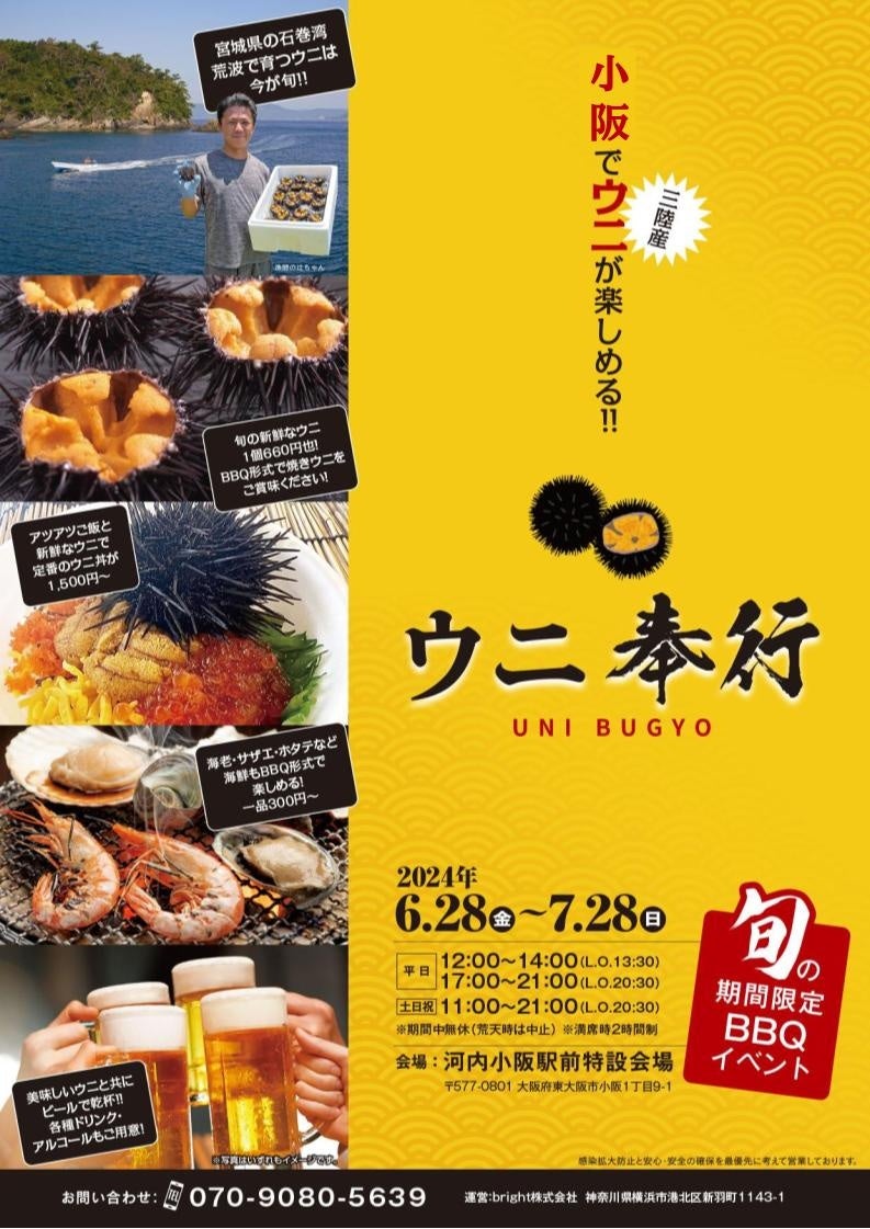 大阪府東大阪市で 6/28-7/28の限定出店!激レア!三陸産の【殻付きウニ】を特価販売!旬のウニを炭火で楽しむ『ウニ奉行 河内小阪駅前特設会場』休日にご家族と!お仕事帰りの皆様も!