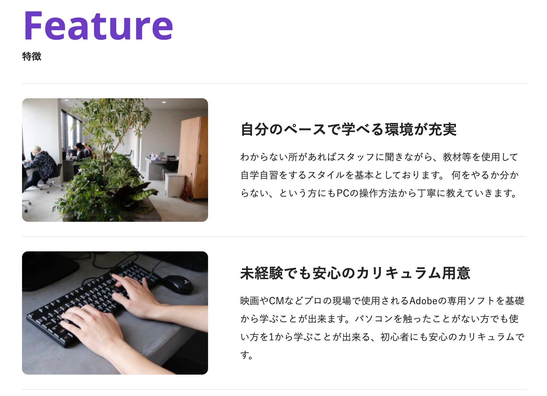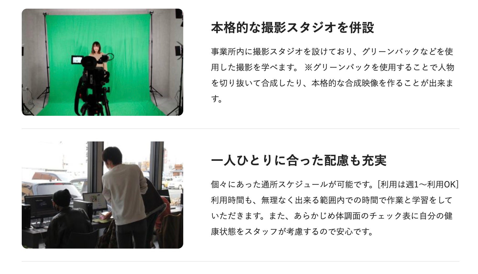 障がい者支援施設・就労支援B型事業所ONEFRAME(ワンフレーム)では、「映像」というスキルに限定し、個性を伸ばすことで得意なことを仕事にできる人材育成を目的としています。映画やCMなどプロの現場で使用されるAdobeの専用ソフト等を使って、専門スタッフから基礎から学ぶことができます。パソコンを触ったことがない方でも使い方を1から学ぶことが出来る、初心者にも安心のカリキュラムになっているのが最大の特徴。事業所内には、撮影スタジオを設けており、グリーンバックなどを使用した撮影も学べる環境が整備されています。