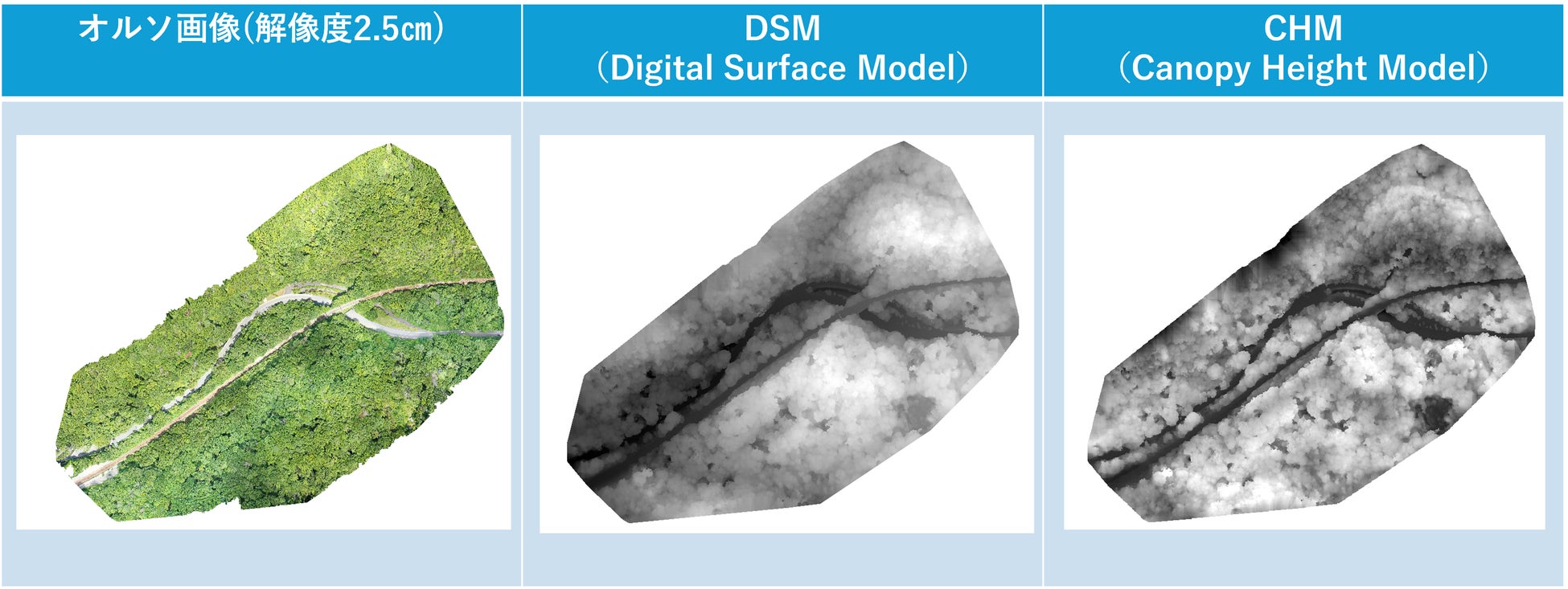 撮影した画像は、DeepForest社の3次元画像合成ソフト「DF BIRD」を使用し、オルソ画像およびDSM(Digital Surface Model)を作成しました。160枚の写真から1時間程度で合成処理が完了しました。また、国土地理院が公開する地面データ(DEM)との差分を計算し、樹木などの高さ情報を示すCHM(Canopy Height Model)を生成しました。