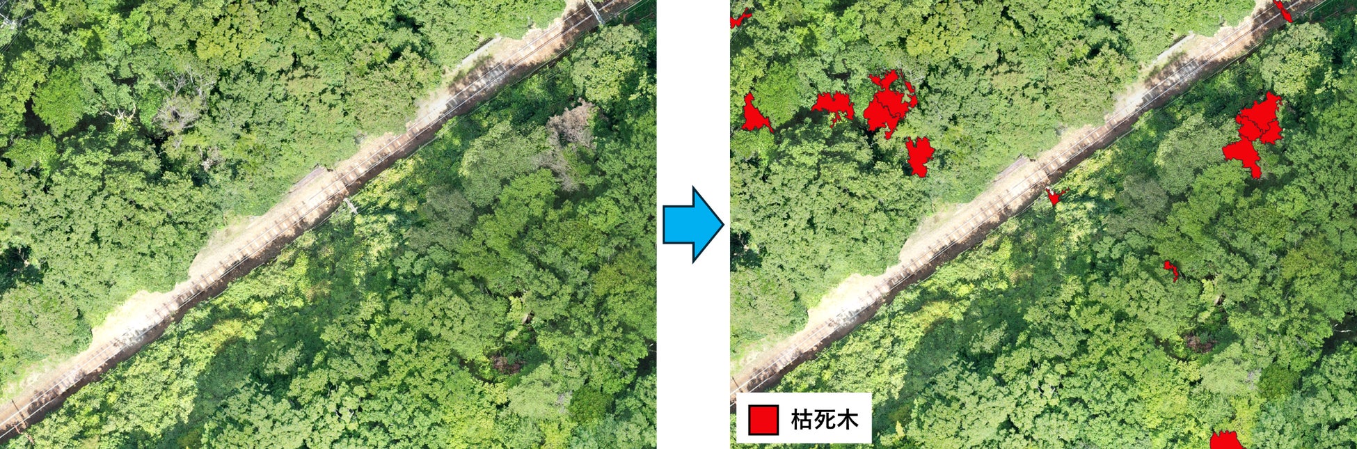近年、ナラ枯れなどにより枯死木が増加していますが、特に山間部などの沿線の枯死木が線路に倒れ、列車の運行を妨げるトラブルが増加しています。これを未然に防ぐためには、日頃から沿線の枯死木を把握し、伐採等の処置を施す必要があります。神戸電鉄ではこの検出業務を作業員の巡回目視点検により行っており、作業に要する手間およびコストが課題となっていました。