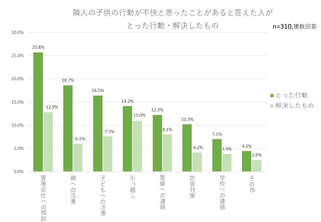 隣人の子どもの行動が不快と思ったことがあると答えた人がとった行動で、「管理会社への相談」25.8%、「警察への連絡」12.3%、「学校への連絡」7.1%と全体の45.2%の約半数近くが第三者へ相談を行っているが、それに対し、解決率は「管理会社への相談」12.9%,「警察への連絡」8.1%、「学校への連絡」3.9%と約半分ほどしか解決ができていないという結果となりました。