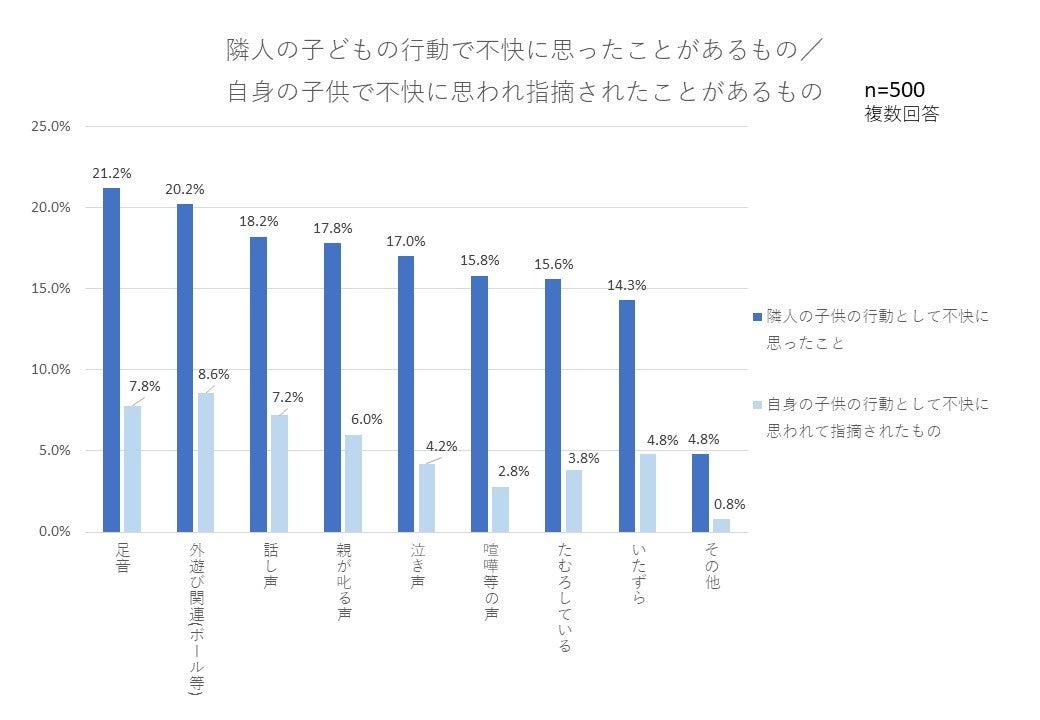 隣人の子どもの行動として不快に思ったことや、自身の子どもの行動として不快に思われ指摘されたことがあるものの調査を行いました。