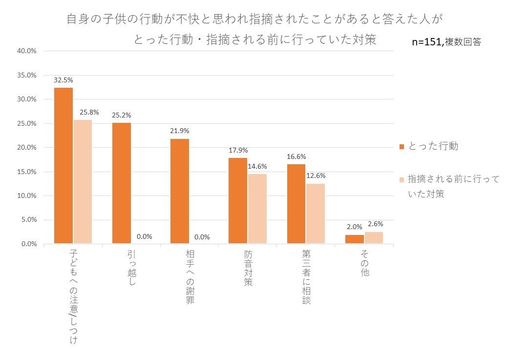 自身の子どもの行動が不快と思われ指摘されたことがあると答えた人が指摘される前に行っていた対策で、「子どもへの注意/しつけ」28.0%、「防音対策」26.2%と既に予防策を講じている人も多いが、「足音」など指摘された数値が不快に思われている数値より高いことから予防策を講じていてもトラブルへと発展している様子だ。