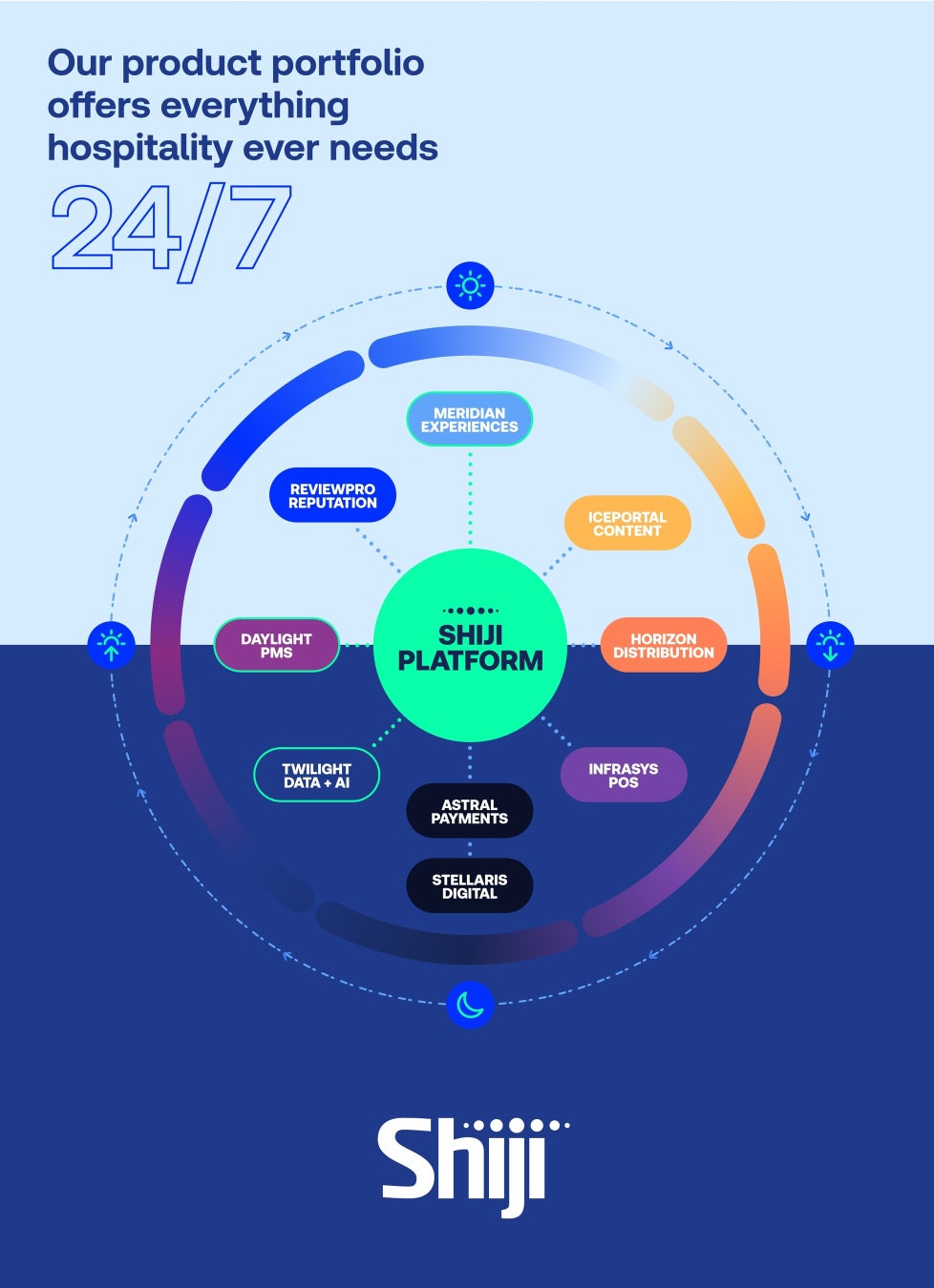 Shijiは、ホスピタリティ業界に革新的なソリューションを提供し、ホテル経営者が昼夜を問わずシームレスなオペレーションを実現できるよう尽力するグローバルテクノロジー企業です。唯一無二のグローバルなホテルテクノロジープラットフォームである「Shiji Platform」を基盤に、クラウドベースのプロダクトポートフォリオを展開しています。これには、プロパティ・マネジメントシステム(PMS)、POS、ゲストエンゲージメント、流通、決済、データインテリジェンスなどのソリューションが含まれ、世界最大級のホテルチェーンを含む91,000以上のホテルが導入しています。