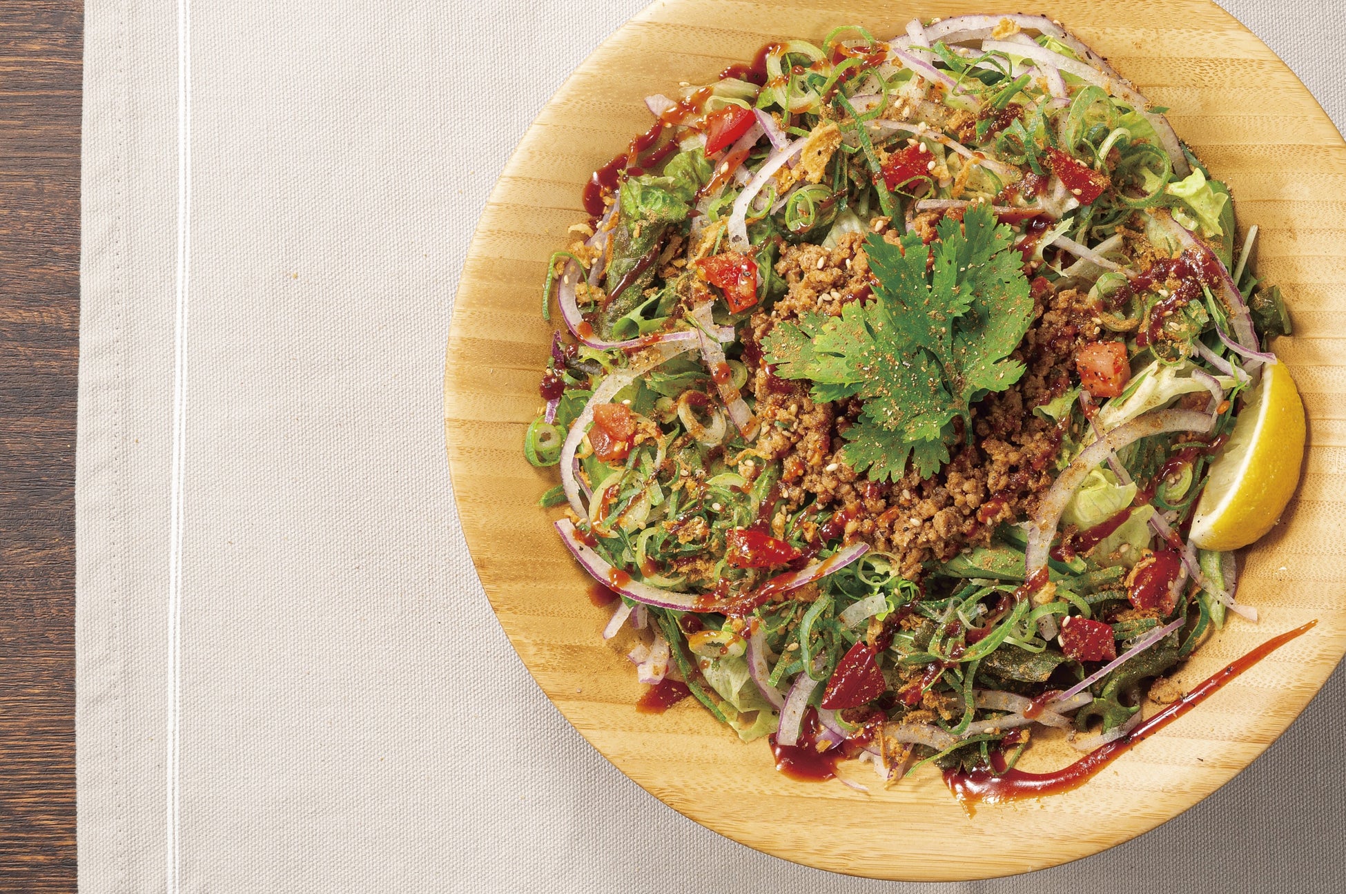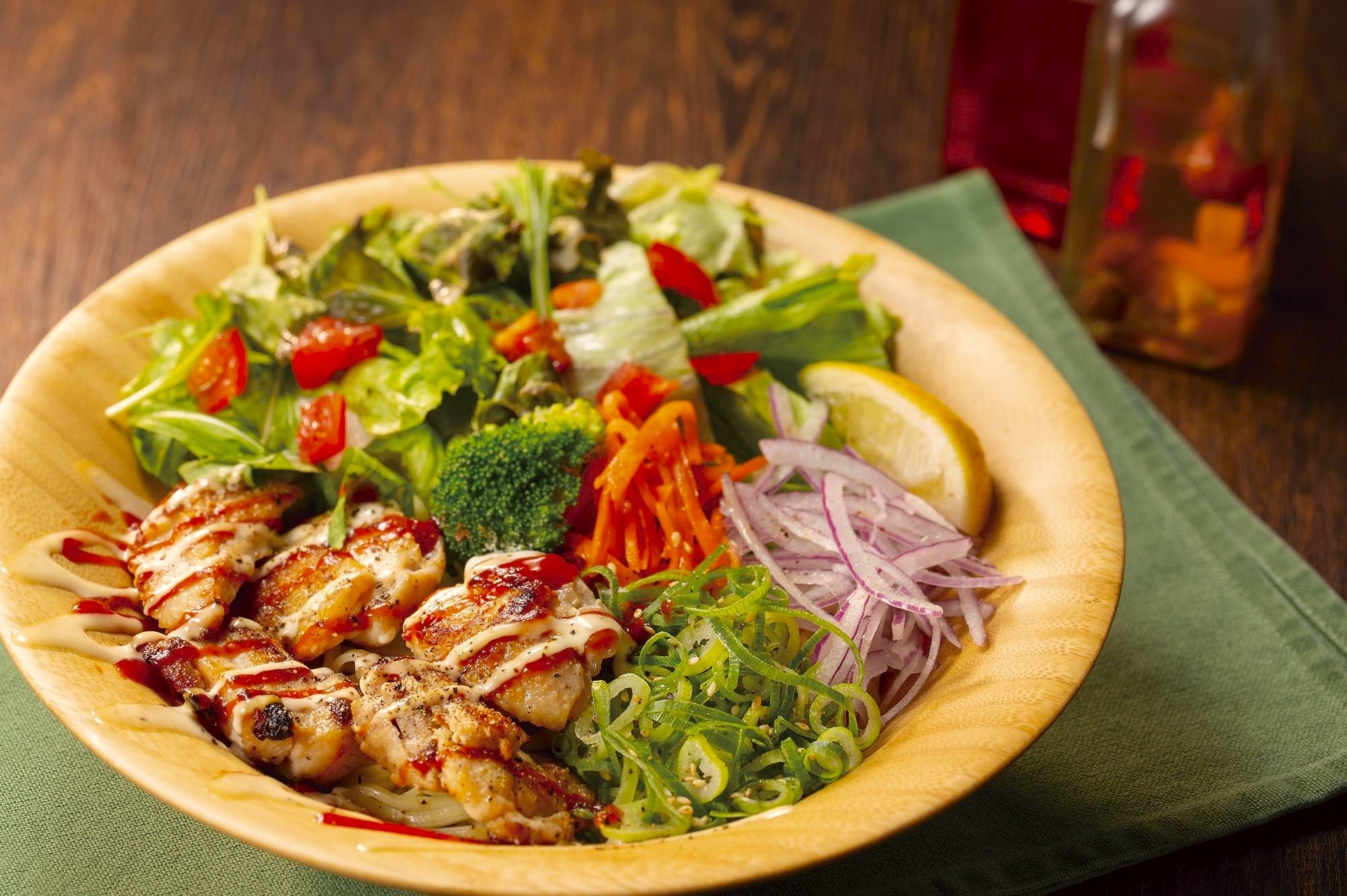カロテンやビタミンC、ミネラルが豊富な緑黄色野菜を中心に6~9種類のフレッシュな野菜を全商品ふんだんに盛り込みます。豊富な種類の野菜は栄養バランスがとれることは勿論、味や食感の違いを楽しむことができ、更にこれを秘伝のタレが絡んだアツアツの麺と混ぜて食べ進めると次第に麺に馴染み、染み出た野菜の旨味がタレと絡み合って奥深い味わいへと変化していきます。