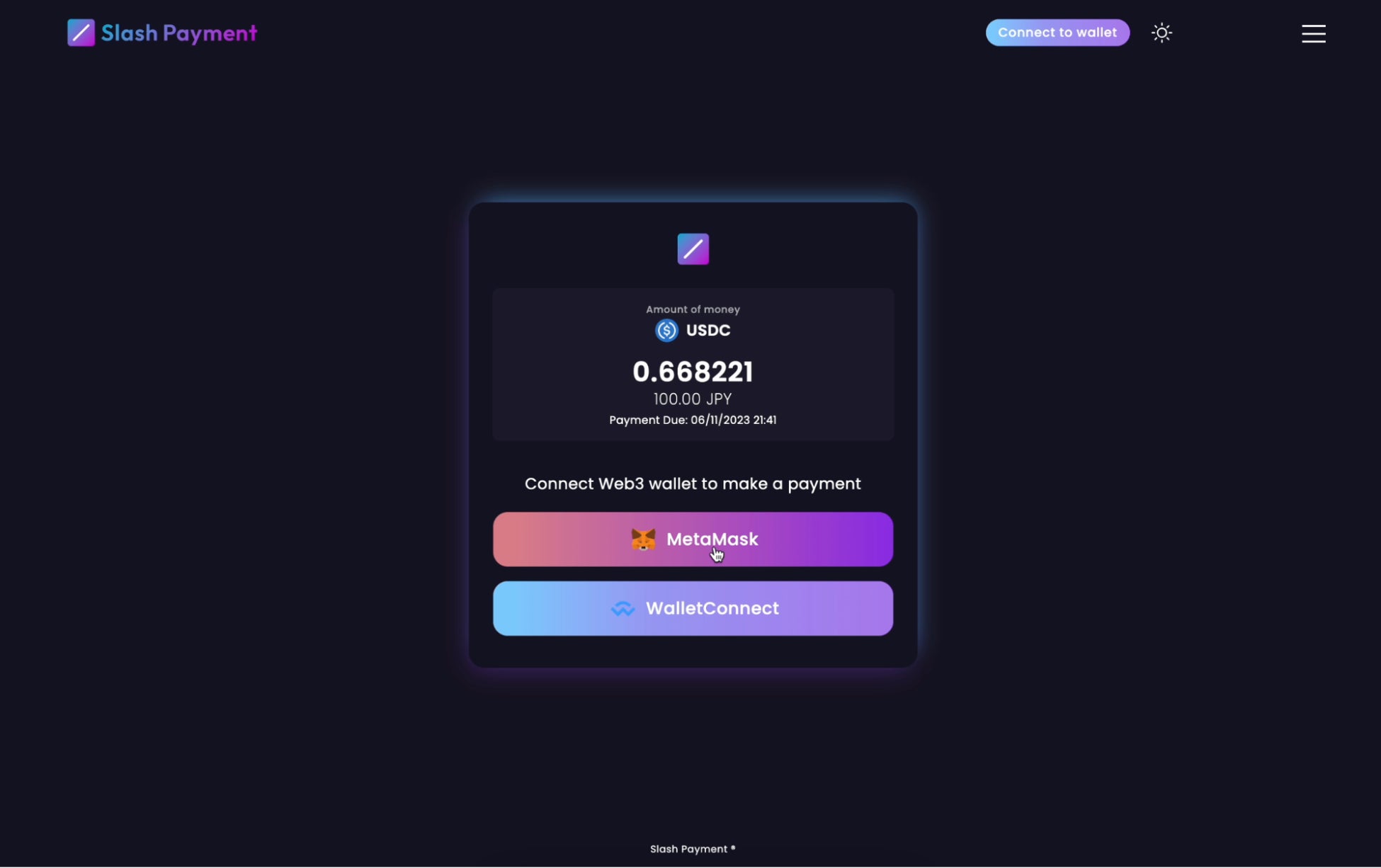 1 各サービスの決済画面からSlash決済画面に遷移し、ウォレットを接続、Arbitrum上で保有しているトークンを選択