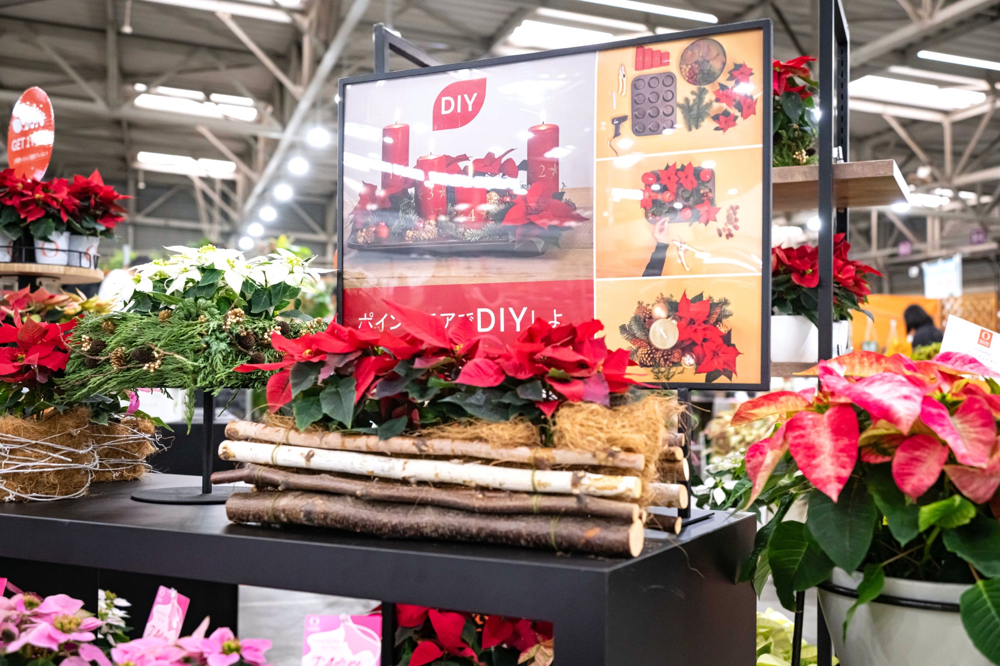 ブース全体(36㎡)は6つのゾーンに分け、花のある暮らしをより身近に、より楽しめるアイデアを詰め込みました。ブース入口では「ポインセチアでDIYしよ!」をテーマに、ミニポインセチアを使った新しい楽しみ方を展示。