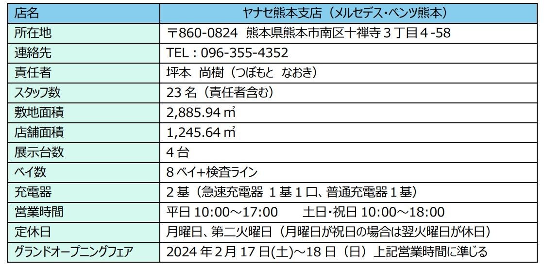 大型ビジョンを配置するなど最新設備が整ったショウルームは、新車 4 台を展示。納車説明を行う「ハンドオーバー」 と、近未来的なキャノピーも備えます。また、8 ベイと検査ラインから成るサービスワークショップは、最新の設備で整 備品質を高めてお客さまの安心で快適なカーライフをサポートします。 ヤナセは、2007 年 6 月に熊本ヤナセ株式会社の営業を引継いで熊本エリアで営業を開始。2017 年 10 月に直営化しました。また、2023 年 4 月に「メルセデス・ベンツ熊本北」の営業を引継いで、新たに「メルセデス・ベンツ熊本サーテ ィファイドカーセンター/メルセデス・ベンツ熊本 北サービスセンター」を開設し、それに併せて「ヤナセ熊本南支店」 (メルセデス・ベンツ熊本南)の名称を「ヤナセ熊本支店」(メルセデス・ベンツ熊本)に変更しました。 ヤナセが展開するメルセデス・ベンツ新車販売店は全国 100 拠点、そのうち九州エリアで 11 拠点を運営します。