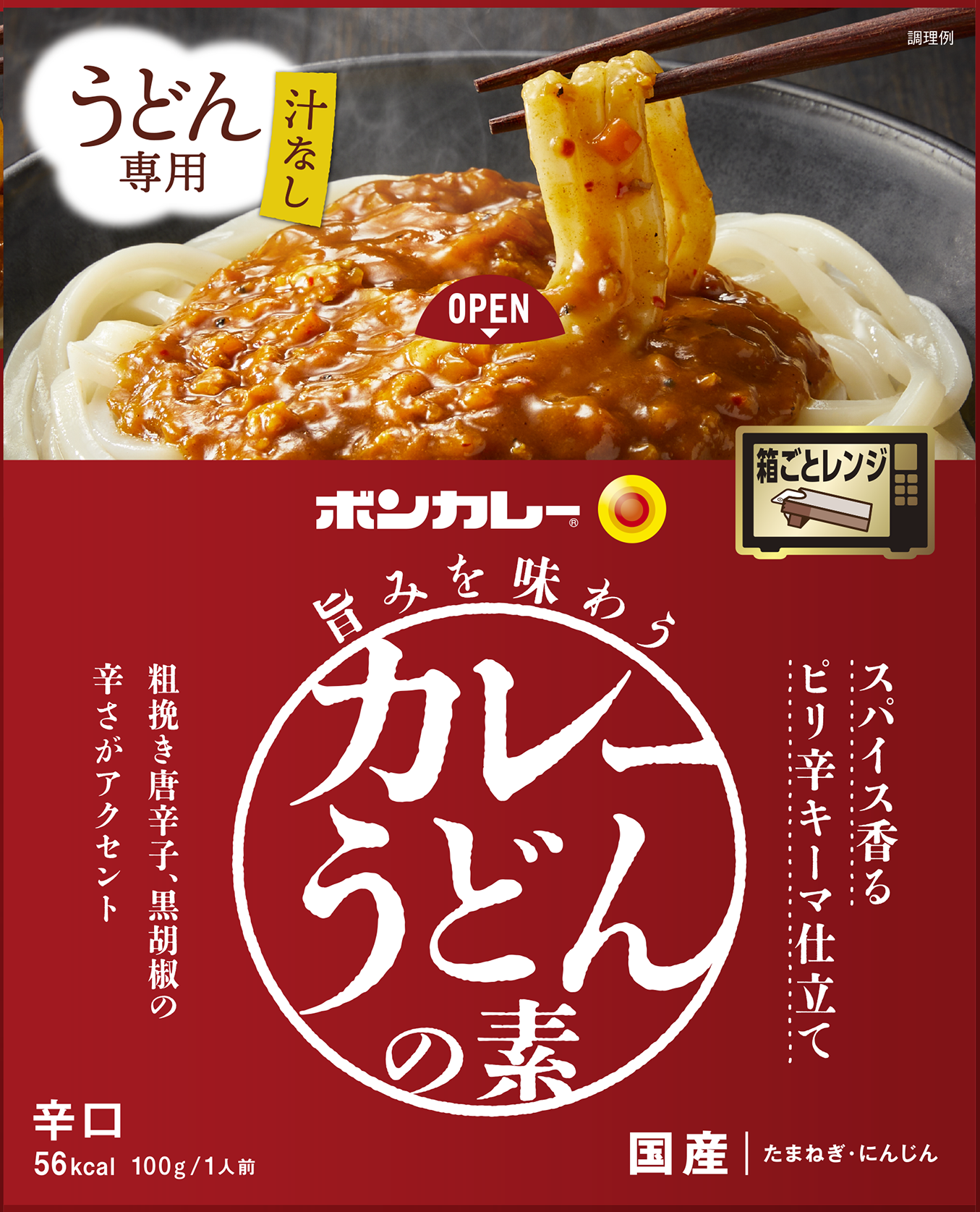 このたびの新製品は、箱ごとレンジで温め、うどんにかけるだけでおいしく簡単にカレーうどんが出来上がります。また、食べたい気分に合わせて楽しめるよう、汁ありと汁なしタイプをご用意しました。汁ありタイプの「だし薫る和風仕立て」は、かつおぶし、北海道産真昆布、長崎県産煮干しの和だしの旨みが特長です。汁なしタイプの「スパイス香るピリ辛キーマ仕立て」は、粗挽き唐辛子、黒胡椒の辛さがアクセントになっています。