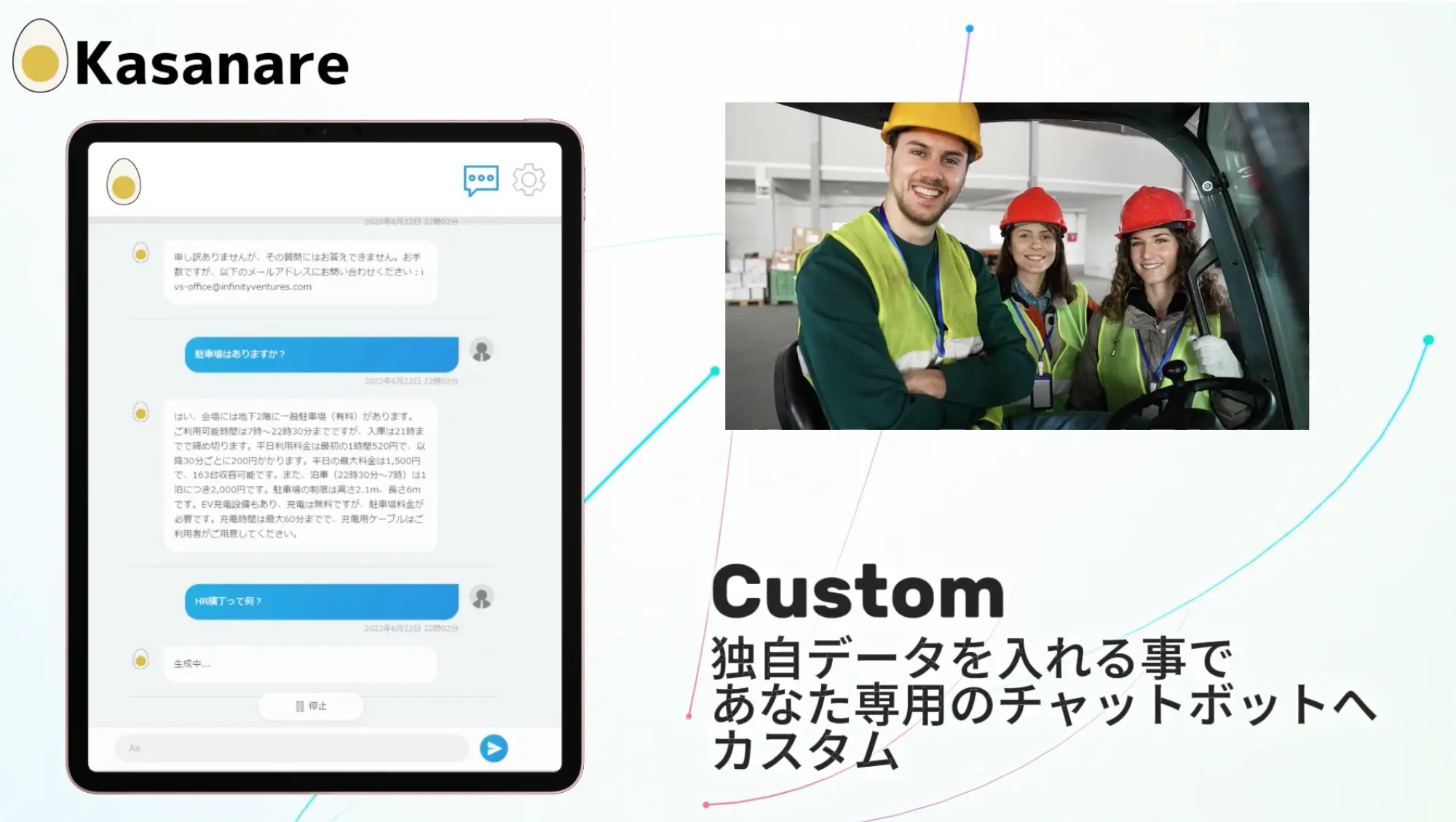 「Kasanare」は、ChatGPT等生成AIの大規模言語モデル(LLM:Large Language Models)により開発されたGenerative AIチャットシステムです。