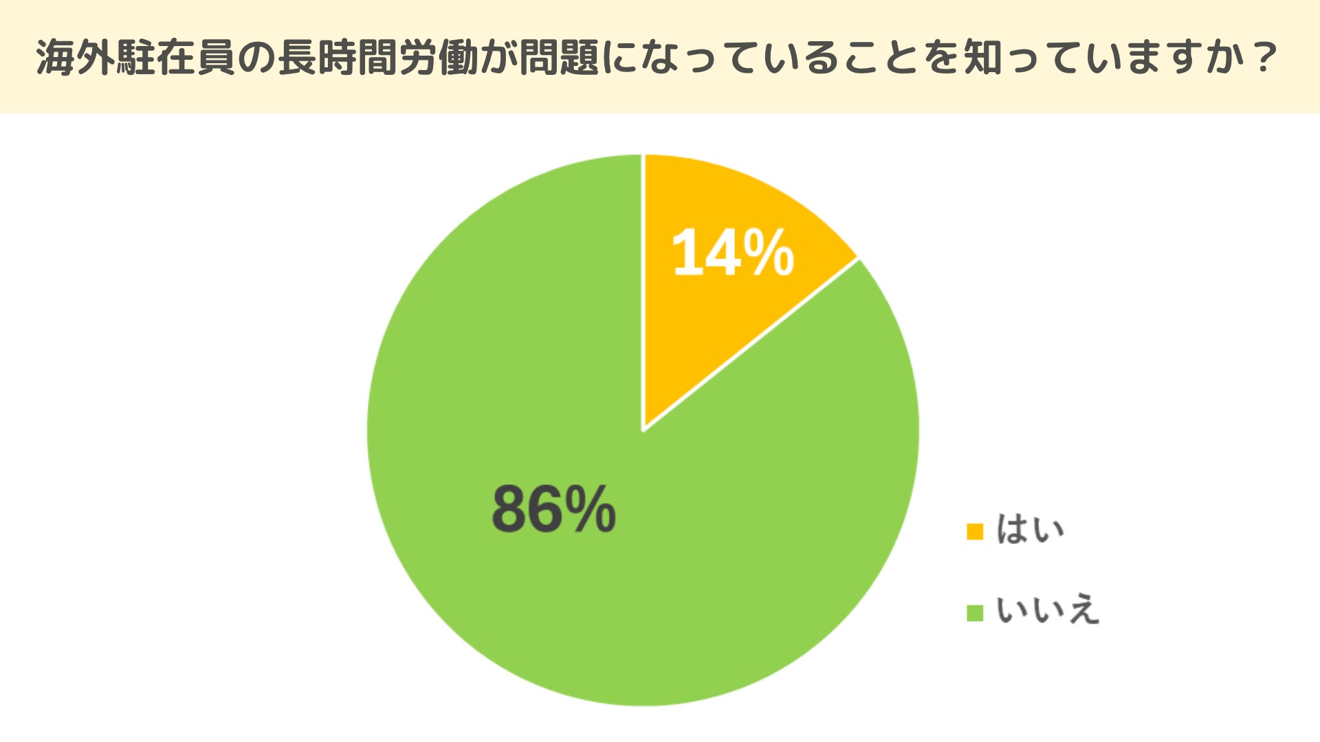 本調査では、「海外駐在員の長時間労働が社会課題として取り上げられていることを知っているか」を問いかけたところ、「知っている」と回答したのはわずか14%にとどまりました。