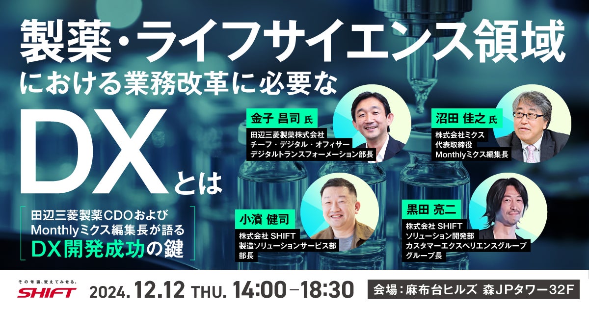お客様の売れるソフトウェアサービス/製品づくりを支援する株式会社SHIFT(本社:東京都港区、代表取締役社長:丹下 大、プライム市場:3697、以下SHIFT)は、田辺三菱製薬株式会社チーフ・デジタル・オフィサー(CDO) デジタルトランスフォーメーション部長・金子昌司氏、株式会社ミクス代表取締役 Monthlyミクス編集長・沼田佳之氏をお招きし、「製薬・ライフサイエンス領域における業務改革に必要なDXとは~田辺三菱製薬CDOおよびMonthlyミクス編集長が語るDX開発成功の鍵~」セミナーを開催します。