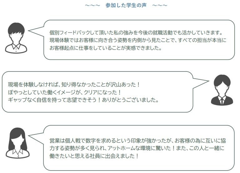 参加した学生からは「現場を知ることの重要性に気が付くことができ、今後の就職活動に活きる経験となった。」「不動産業界について学ぶことができ、非常に有意義な時間を過ごすことができました。」等の感想をいただき、ご好評いただいております。今後は9月に2回目の開催を予定しています。