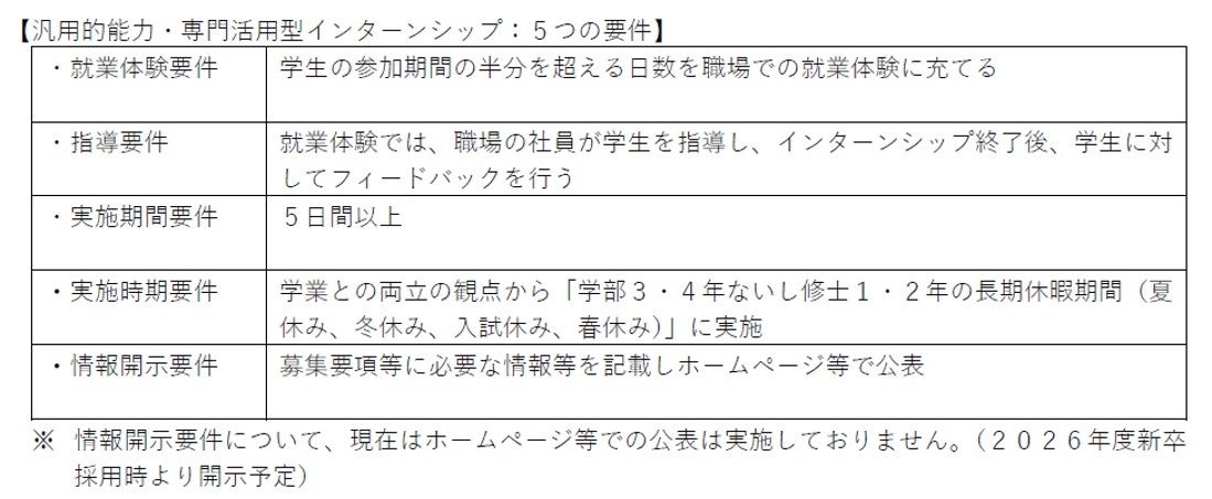 汎用的能力・専門活用型インターンシップは、産学協議会が合意した以下の5つの要件を満たすプログラムで、就業体験を通じて、学生にとっては自らの能力を見極め、企業にとっては学生の評価材料を取得することを目的としたプログラムです。