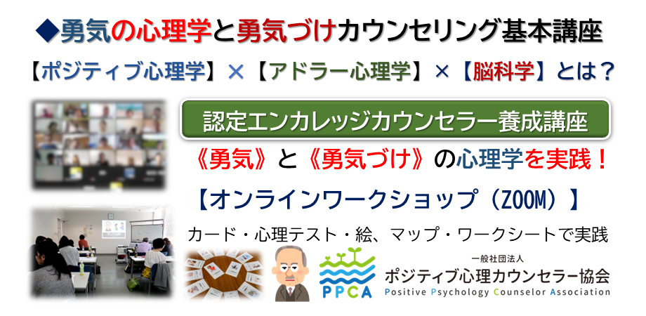 一般社団法人 ポジティブ心理カウンセラー協会(本部:東京都港区)が主催,一般社団法人コーチング心理学協会が共催、2023年12月9日(土) 及び22(日) 9:30~ 17:30(2日間・両日),オンライン・ワークショップにて,【勇気の心理学と勇気づけカウンセリング基本講座2023」を開催いたします。