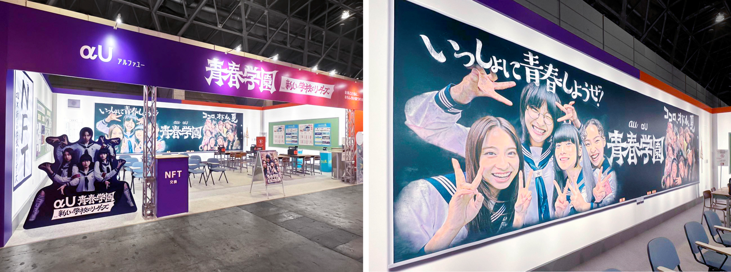 今回のキャンペーンに伴い、8月19日・20日に開催したSUMMER SONIC 2023東京会場では、特別ブース「au & αU presents 『青春学園』 feat. 新しい学校のリーダーズ」を出展しました。事前にダウンロードした「一筆入魂NFT」を提示いただいた方に、会場限定配布のNFTやオリジナルのコラボレーショングッズをプレゼントしたほか、新しい学校のリーダーズのメンバー等身大パネル、休憩しながらクリーンエネルギー充電やFree Wi-Fiが利用できるスペース、最新のGoogle Pixel Foldを体験できるコーナーを用意しました。ブースを訪れたファンからは「学校の雰囲気がかわいい!」「書下ろし書道が欲しい!」といった好評の声をいただき、2日間で延べ約3,000人が特別ブースを体験しました。