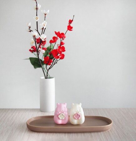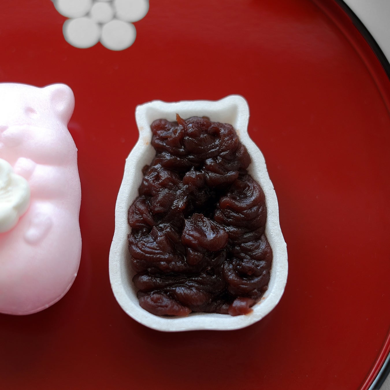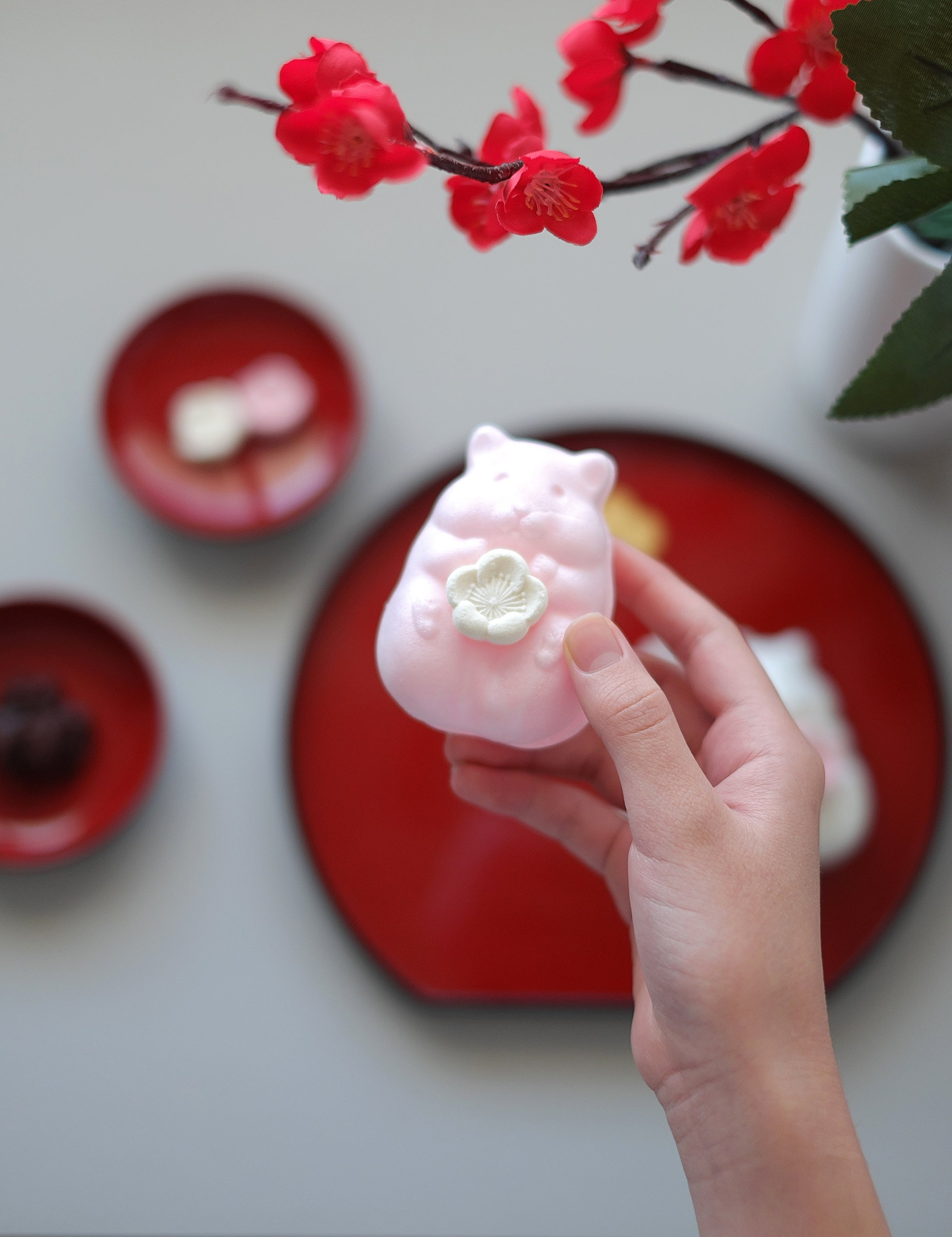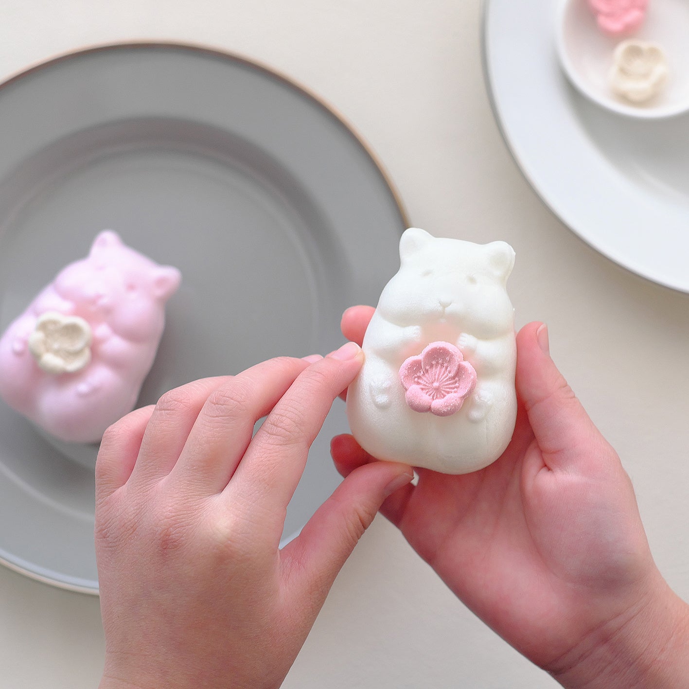 「ハムスターモナカ紅白」は、紅白カラーのモナカ皮に、甘さ控えめのつぶ餡、そして梅型のらくがんがセットになった、見た目も味もおめでたい和菓子です。ご自身で餡を詰めて仕上げるスタイルで、手作りの楽しさも味わえます。ハムスターのおなか部分にらくがんを添えると、まるで梅を抱えているような愛らしい姿に。お祝いの気持ちをそっと添える、心温まる一品です。