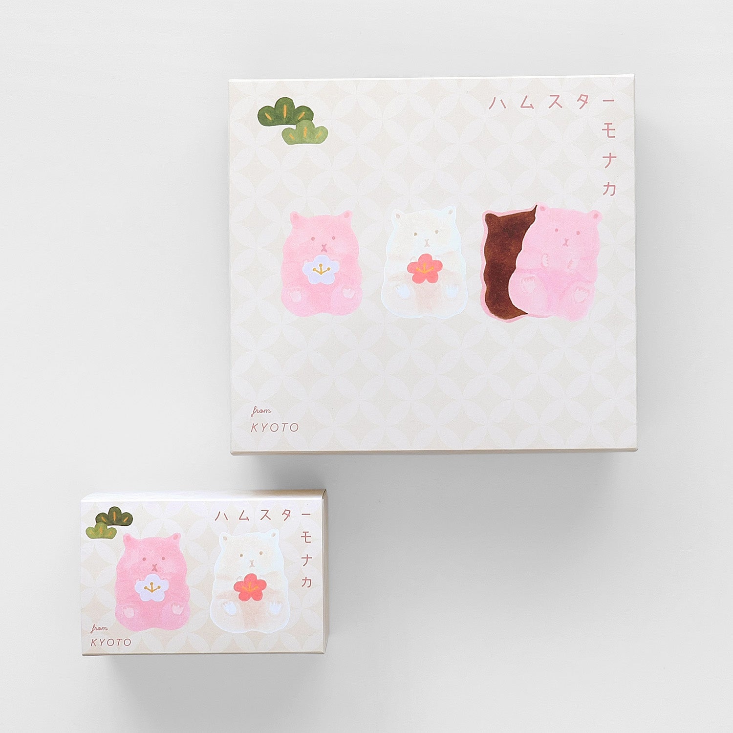 京都の老舗菓子屋「青木光悦堂」と京都の企画会社「株式会社2時」のコラボ商品「ハムスターモナカ」の紅白バージョン2個入りと6個入りを発売。
