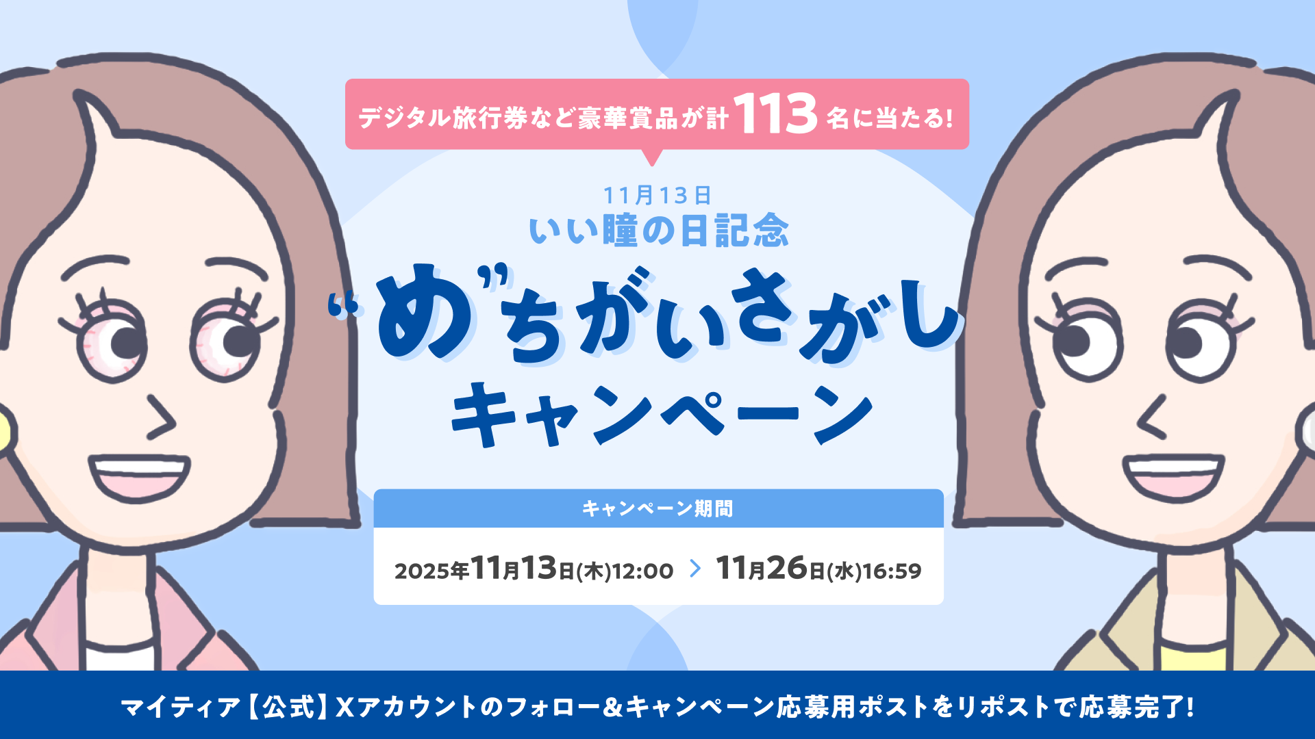 マイティア【公式】Xアカウントをフォローして、キャンペーン期間中に応募用ポストをリポストすると応募完了。さらに、「“め”ちがいさがし」のイラストにいる、充血していない「いい瞳の人」を探して、リプライもしくは引用リポストで回答すると当選確率がUPします。