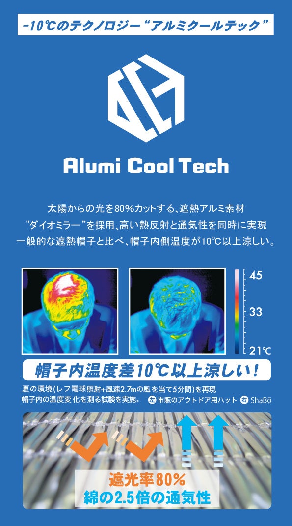 アルミクールテックの効果: 弊社独自の技術である「アルミクールテック」を使用した「ウルトラライトハット」は、太陽熱を反射し、風だけを通す特殊遮熱素材を採用しています。これにより炎天下でも頭部を涼しく保ち、無帽の時に比べて実際に-10℃の差が感じられるという実験結果を取得。これにより、暑い日でも涼しさを実感でき、快適にアウトドア活動を楽しむことができます。