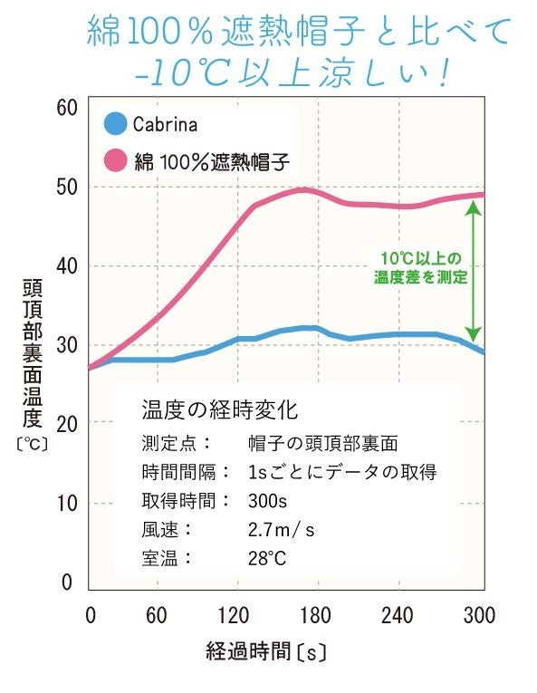 名古屋市工業研究所にて、涼しさの試験を実施したところ、他の遮熱帽子と比較して10℃以上涼しいという結果を取得しました。