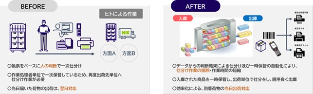 従来は人が実施していた入庫・検品作業、システム入力作業、出庫・仕分作業を自動化し、誰でも簡単に作業ができる環境を整備したことで、ヒューマンエラーを排除し、さらに入庫から出庫までのリードタイム50%の短縮を実現しました。
