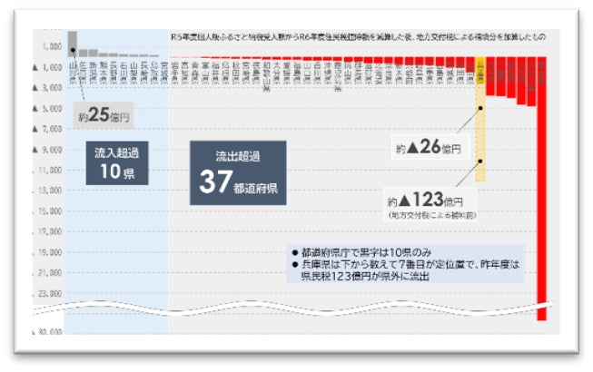 兵庫県はふるさの納税による多額の流出超過(都道府県民税控除額)を抱えており、令和5年度においても、その額は約123億円(地方交付税による減収額補填前)と、全国で7番目に大きな額となっています。