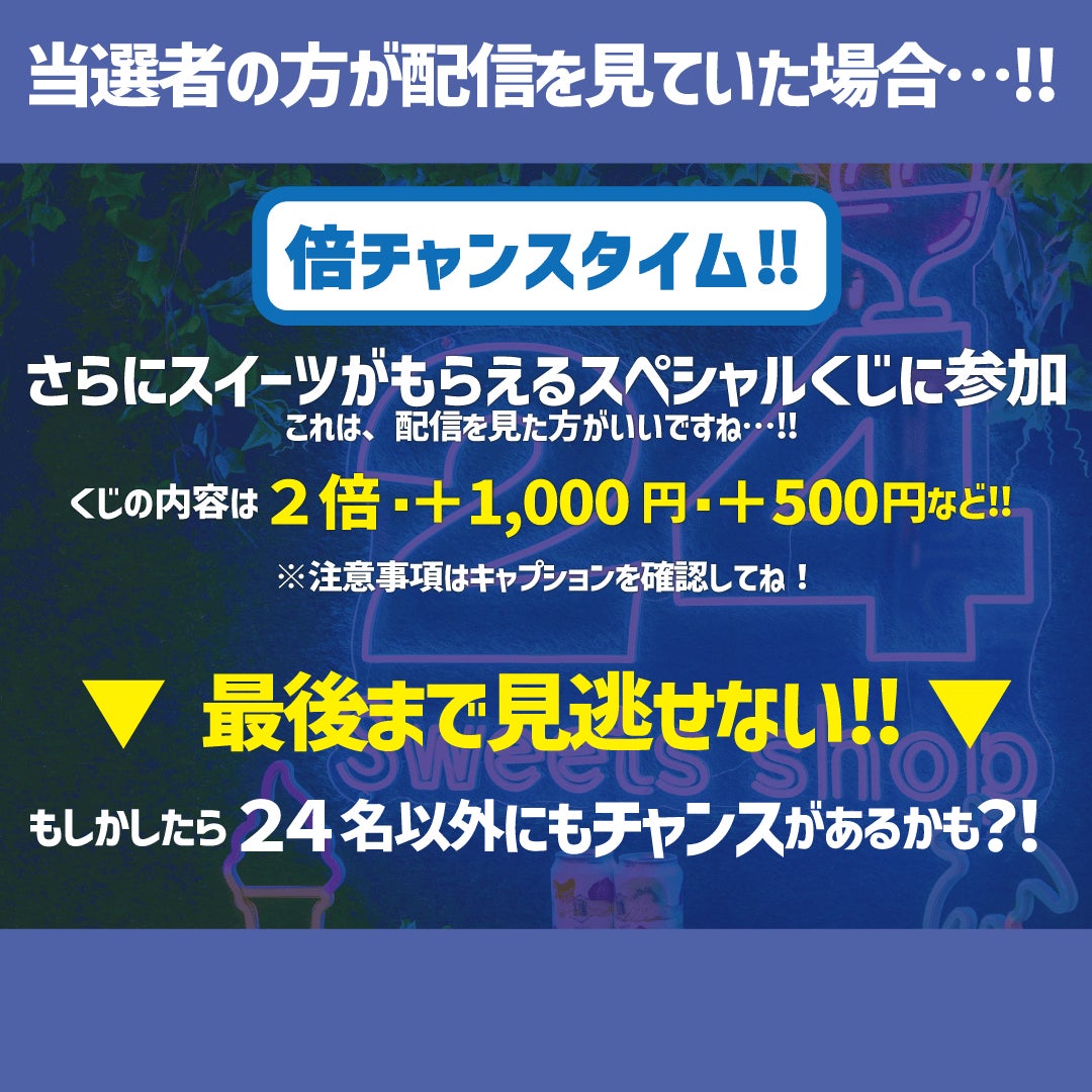 当選人数は過去最多の24名‼︎全国各地にある24スイーツショップの購入レシートでご参加いただけます。当選者の方には、さらに特別な優待をご用意しております‼︎