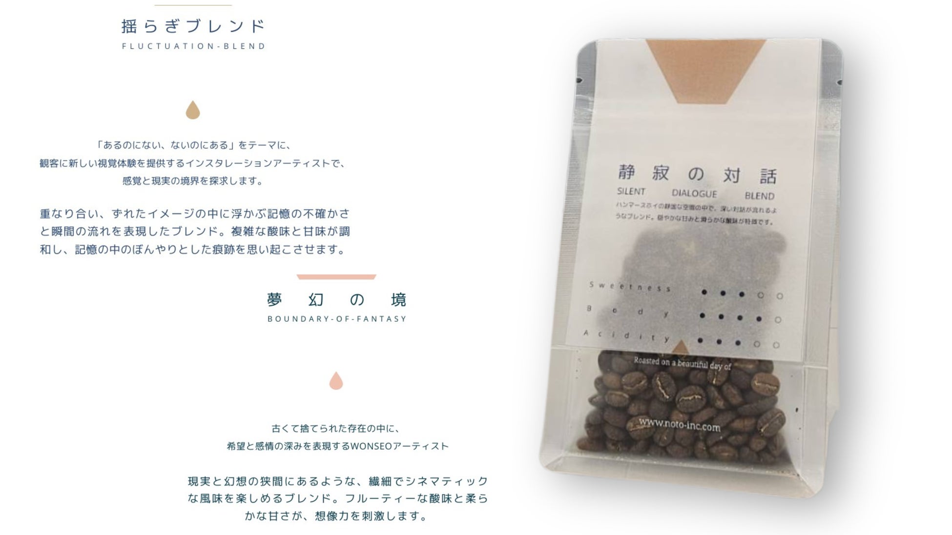 本展の特別企画として、AIがアーティストの作品から着想を得て独自のコーヒーブレンドを生み出す「ジェネラティブコーヒー」を展開します。韓国・ソウルの人気コーヒーショップ「Noto」(https://www.instagram.com/noto_inc/)との協働により、各アーティストの作品世界を味わいとして表現。アーティスト別デザインによる特別パッケージで限定販売します。