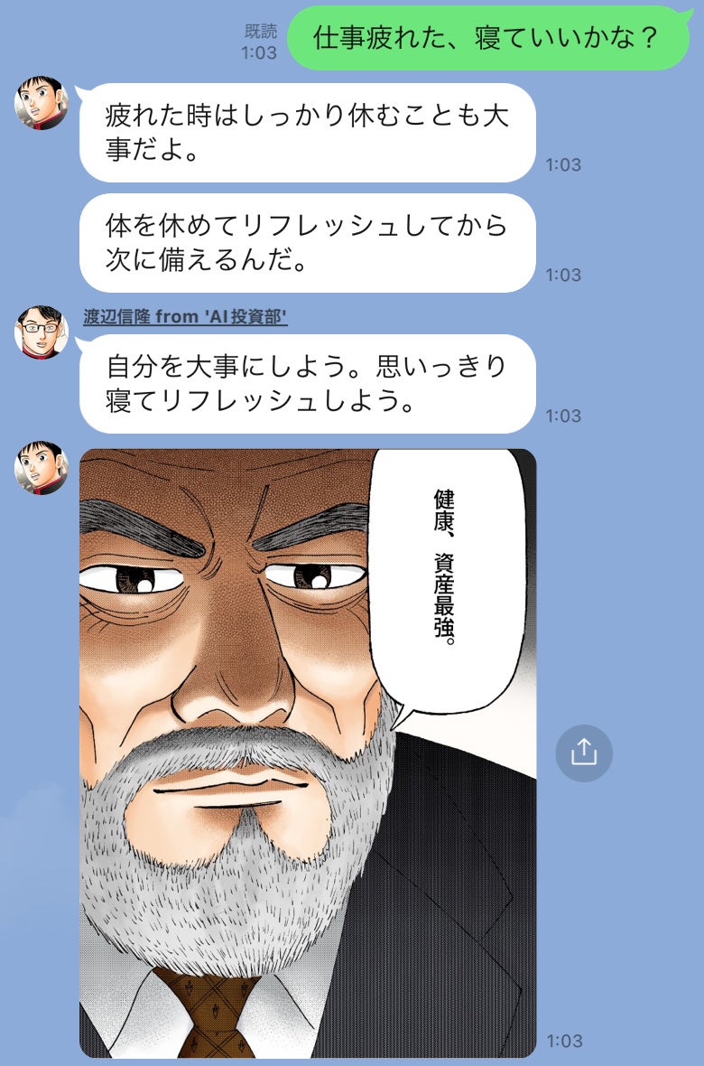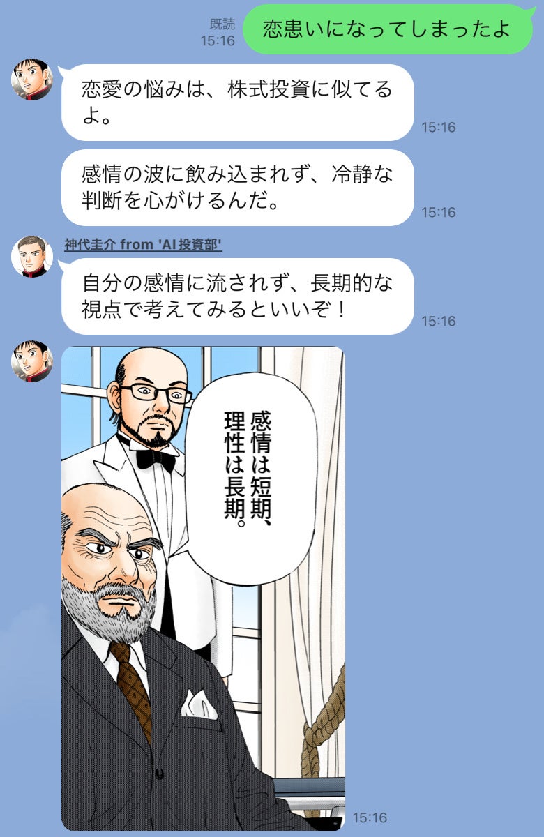「AI投資部」では、ユーザーの日常の疑問や悩みに対して、投資の知識を絡めた返答を提供します。会話の最後には、AIが生成した格言めいたコラージュ画像が送られ、教育的でありながらもユーモアのあるやりとりが楽しめます。これにより、投資に対する関心を引き出し、知識を深めるきっかけを創出します。