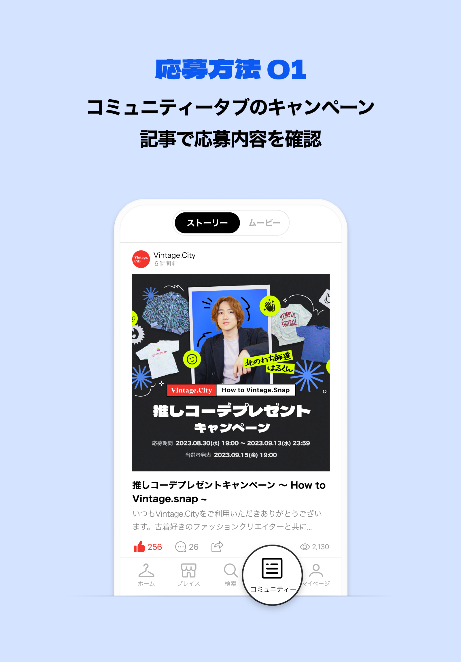 STEP1.ヴィンテージ・ファッション・アプリ「Vintage.City(ヴィンテージ・シティ)」内の「コミュニティ」ページに公開される「キャンペーン記事」で応募内容を確認。
