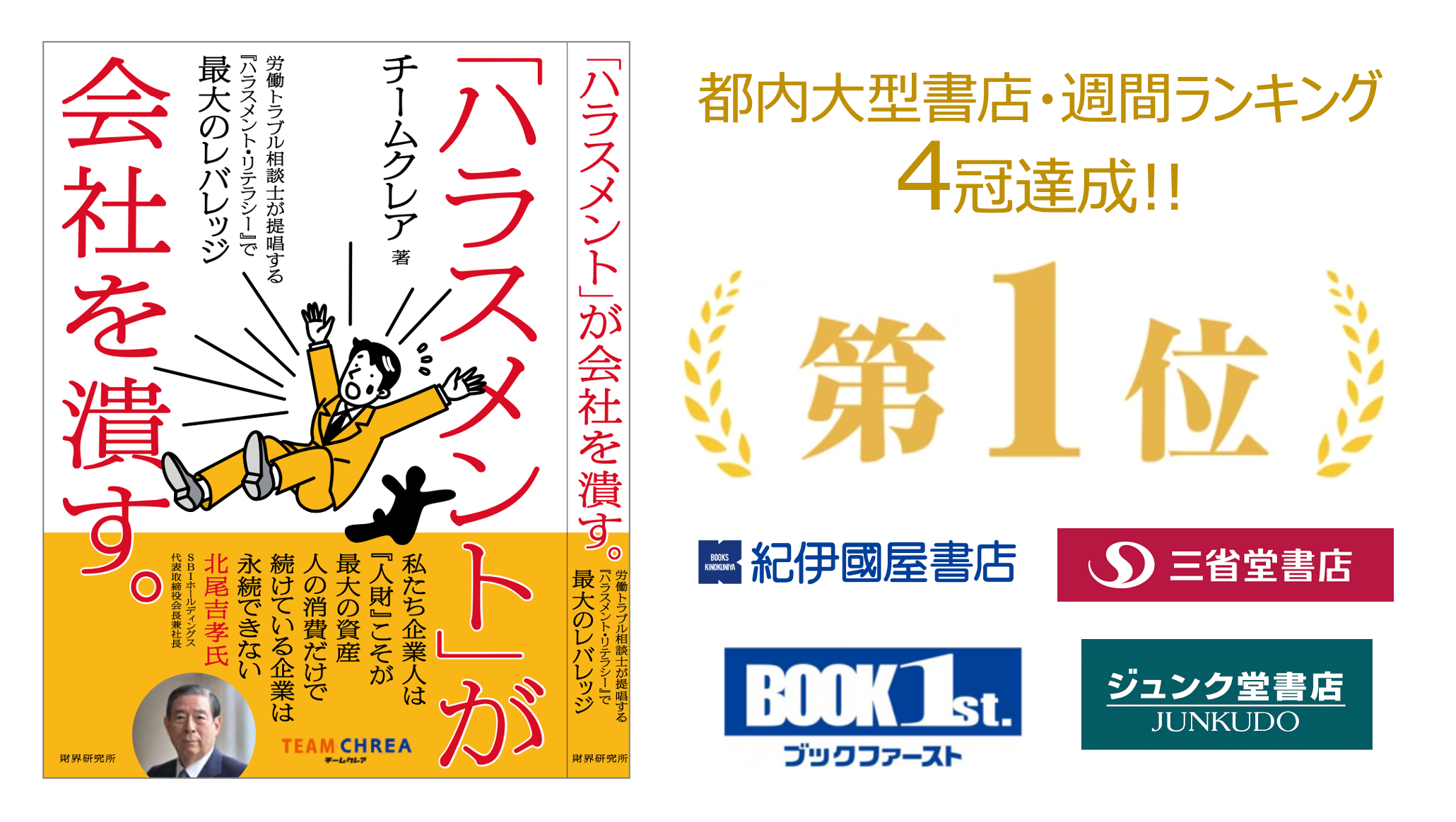 この度、クレアの社会的な事業が評価され、経営者のノーベル賞と評される財界研究所の厳正な審査を通過して、出版に至りました。財界研究所から出版した「ハラスメントが」会社を潰す。(チームクレア著)が三省堂書店、ブックファースト、紀伊國屋書店、ジュンク堂の4店舗ですの週間ランキング(ビジネス部門)で1位を獲得しました。