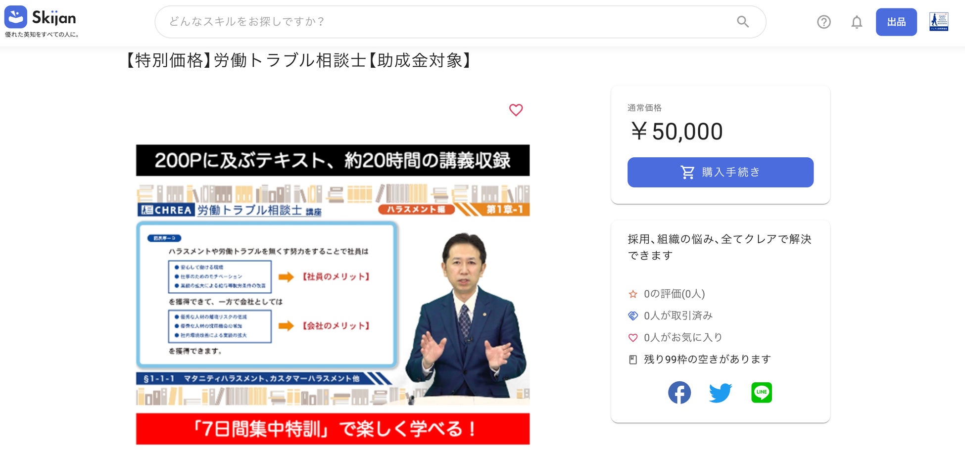 スキジャンは『優れた英知をすべての人に。』日本、アジアに展開するグローバル・スキルシェア・プラットフォームの開発と提供により人々の生活の革命的発展と貧困等の社会問題の解決を実現してくオンライン完結のスキル売買プラットフォームです。英語、タイ語(今後言語を追加予定)に、即時変換するという機能も、実装されており、タイ、インドネシア、インドなどのアジア、欧州、米国等への販売も多数実現しています。クレアでは日本への事業展開を検討しているアジア各国の企業において、日本の労働環境、法整備について学習できるコンテンツとしてのニーズを踏まえてこの度、出品に至りました。