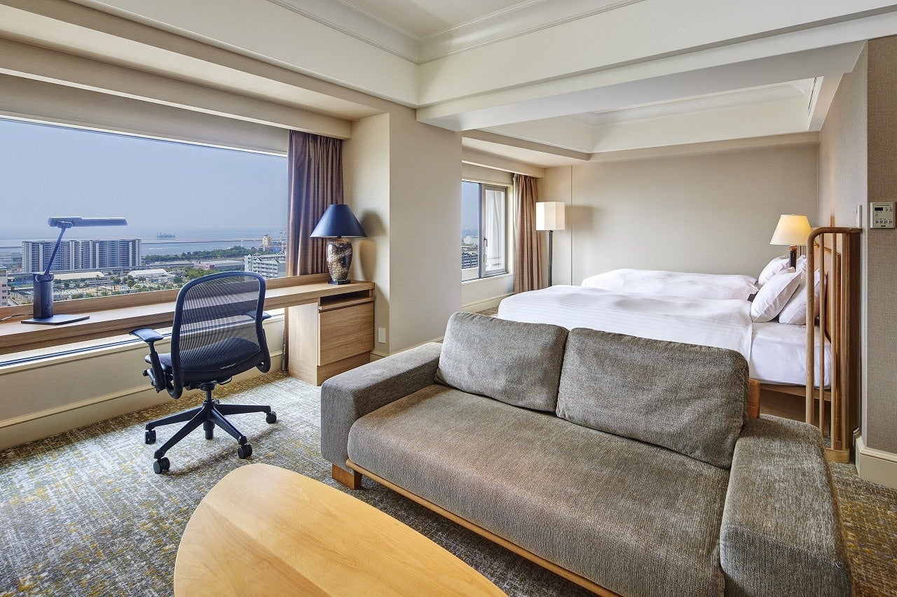 窓からは神戸のオーシャンビューが広がり、利便性を追求した49㎡のジュニアスイートルーム。