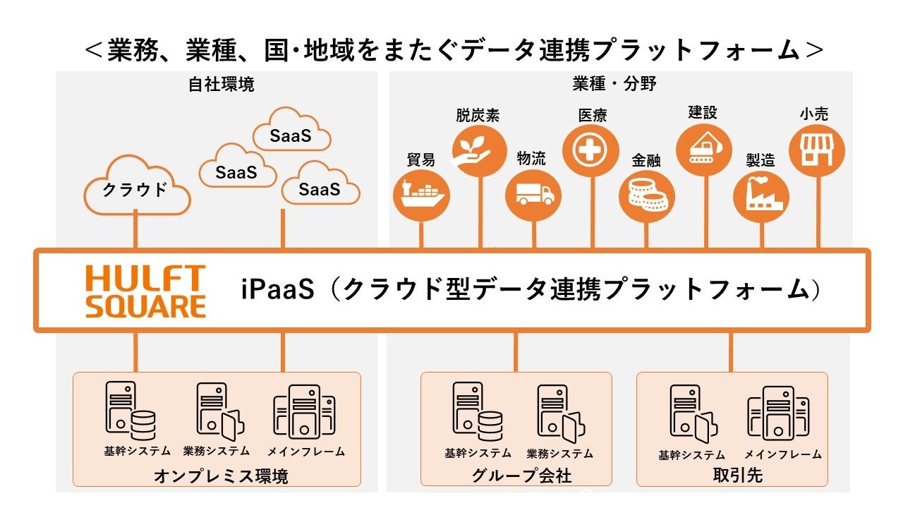 HULFT Squareは、DX実現に必要な「データ活用するためのデータ準備」や「業務システムをつなぐデータ連携」を支援する日本発のiPaaS(クラウド型データ連携プラットフォーム)です。オンプレミス・クラウド・SaaSなどの環境に分散し管理されているさまざまなデータを、業務システム間、業種、国・地域をまたぎデータ連携させることができます。