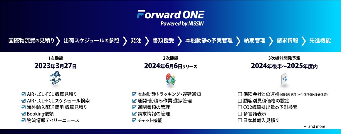 株式会社日新(神奈川県横浜市、代表取締役社長:筒井雅洋、以下当社)は、デジタルフォワーディングサービス「Forward ONE」で「作業進捗管理・本船動静トラッキング機能」の提供を開始いたしました。