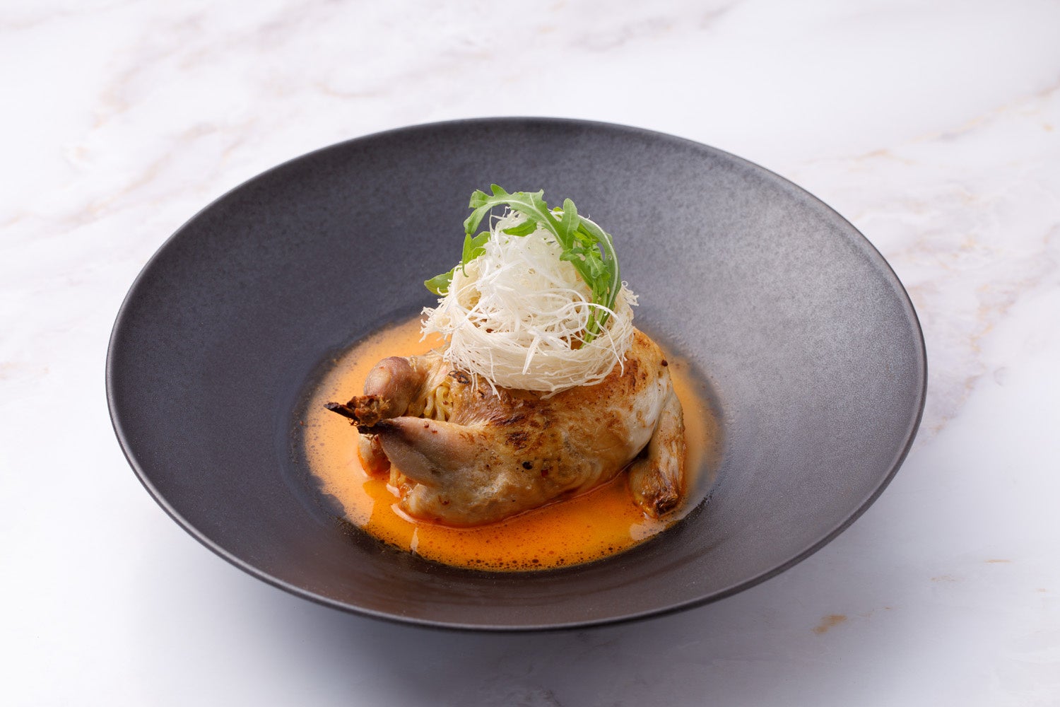 麺と肉みそをうずらに詰め、丸焼きしてスープを注いだ、迫力ある担々麺。フランス料理のうずらのファルシからインスピレーションを得て担々麺と融合させた、ユニークな一皿をお楽しみください。